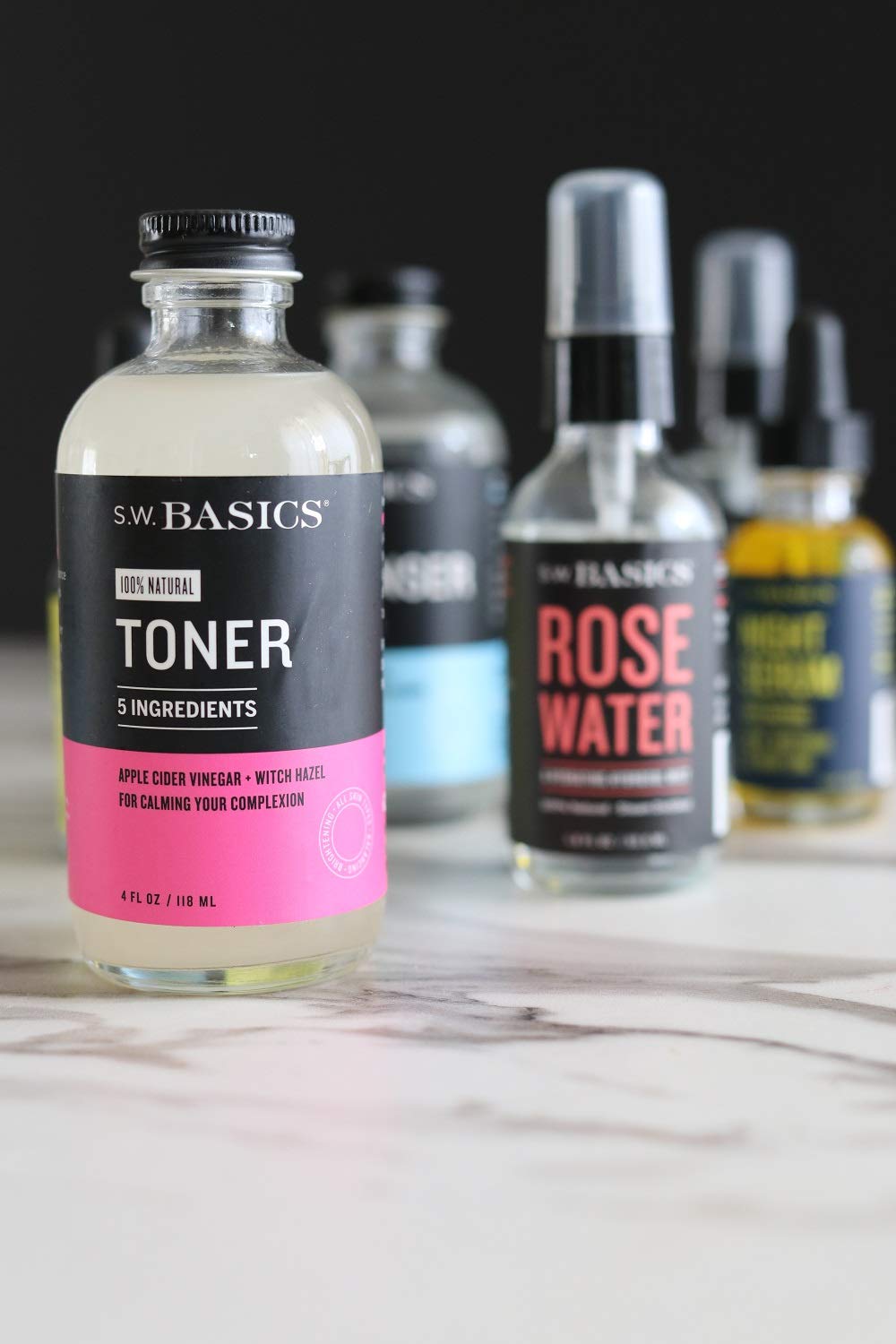 About this item EVENS SKIN TONE: This natural face toner is great for all skin types including sensitive and acne-prone skin. Organic apple cider vinegar toner helps even skin tone and calm redness. NEUTRALIZES PH AND BALANCES OIL PRODUCTION: The organic witch hazel and apple cider vinegar makes this facial toner perfect for waking up less oily and less dry, while evening out skin tone. MADE SIMPLY WITH 5 INGREDIENTS: Alcohol free, pure and simple ingredients include organic, raw apple cider vinegar, organic witch hazel, organic essential oils (sandalwood and clary sage), and water. SUSTAINABLE AND NATURAL INGREDIENTS: We only use truly natural ingredients that are certified organic, fair trade, or sourced from family farms. SIMPLE INGREDIENTS: At S.W. Basics, our whole thing is that fewer ingredients means gentler skincare. And the simpler your routine the better. Our products are effective, easy to use, and made for everyone.  See more product details,EVENS SKIN TONE: This natural face toner is great for all skin types including sensitive and acne-prone skin. Organic apple cider vinegar toner helps even skin tone and calm redness,NEUTRALIZES PH AND BALANCES OIL PRODUCTION: The organic witch hazel and apple cider vinegar makes this facial toner perfect for waking up less oily and less dry, while evening out skin tone,MADE SIMPLY WITH 5 INGREDIENTS: Alcohol free, pure and simple ingredients include organic, raw apple cider vinegar, organic witch hazel, organic essential oils (sandalwood and clary sage), and water,SUSTAINABLE AND NATURAL INGREDIENTS: We only use truly natural ingredients that are certified organic, fair trade, or sourced from family farms,SIMPLE INGREDIENTS: At S.W. Basics, our whole thing is that fewer ingredients means gentler skincare. And the simpler your routine the better. Our products are effective, easy to use, and made for everyone