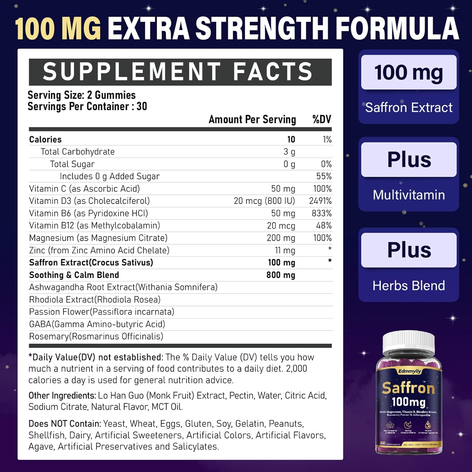 High-Potency Formula: Our Saffron Gummies are packed with 100mg of Saffron Extract, Magnesium Citrate, Zinc, multivitamin, GABA, and a soothing herbal blend featuring Rhodiola, Ashwagandha Root, Passion Flower, and Rosemary. This natural and highly bioavailable formula supports optimal absorption in the body, while also promoting positive m00d, immune health, increased energy and f0cus, c almness, and better Zzz quality