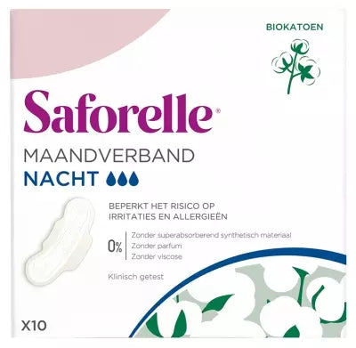 Saforelle Night Sanitary Napkins 10 Sanitary Napkins Are Long, Extra-Fine Napkins With Organic Cotton Fins, Which Helps Reduce The Risk Of Irritation And Allergies. They Provide Safe Absorption For The Well-Being Of Your Privacy. They Are Individually Wrapped. The Absorbent Core And Film Are Organic Cotton, The Film Is Biodegradable And Waterproof And The Individual Packaging Is Biodegradable. Tested Under Dermatological And Gynecological Control. Without Synthetic Super Absorbent, Fragrance Or Viscose. Gots Certified: Global Organic Textile Standard