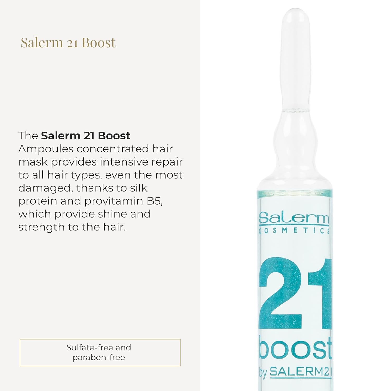 HAIR MASK: The Salerm 21 Boost Ampoules concentrated hair mask performs intensive repair on all hair types, even the most damaged, thanks to silk protein and provitamin B5 that add shine and strength to the hair