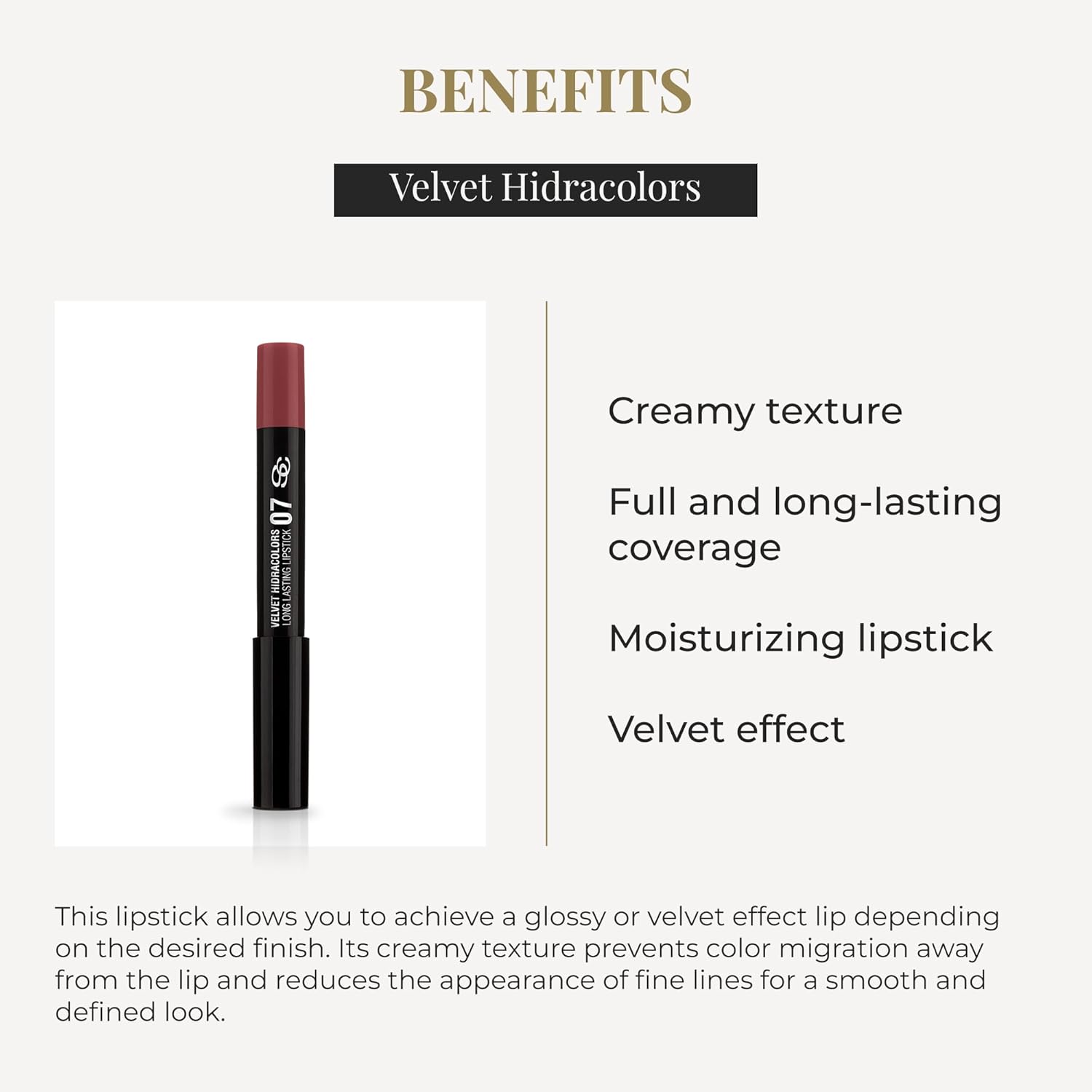 VELVET EFFECT: Achieve a velvet lip effect depending on the desired finish. Its creamy texture limits color migration outside the lip and reduces the appearance of fine lines for a smooth and defined look