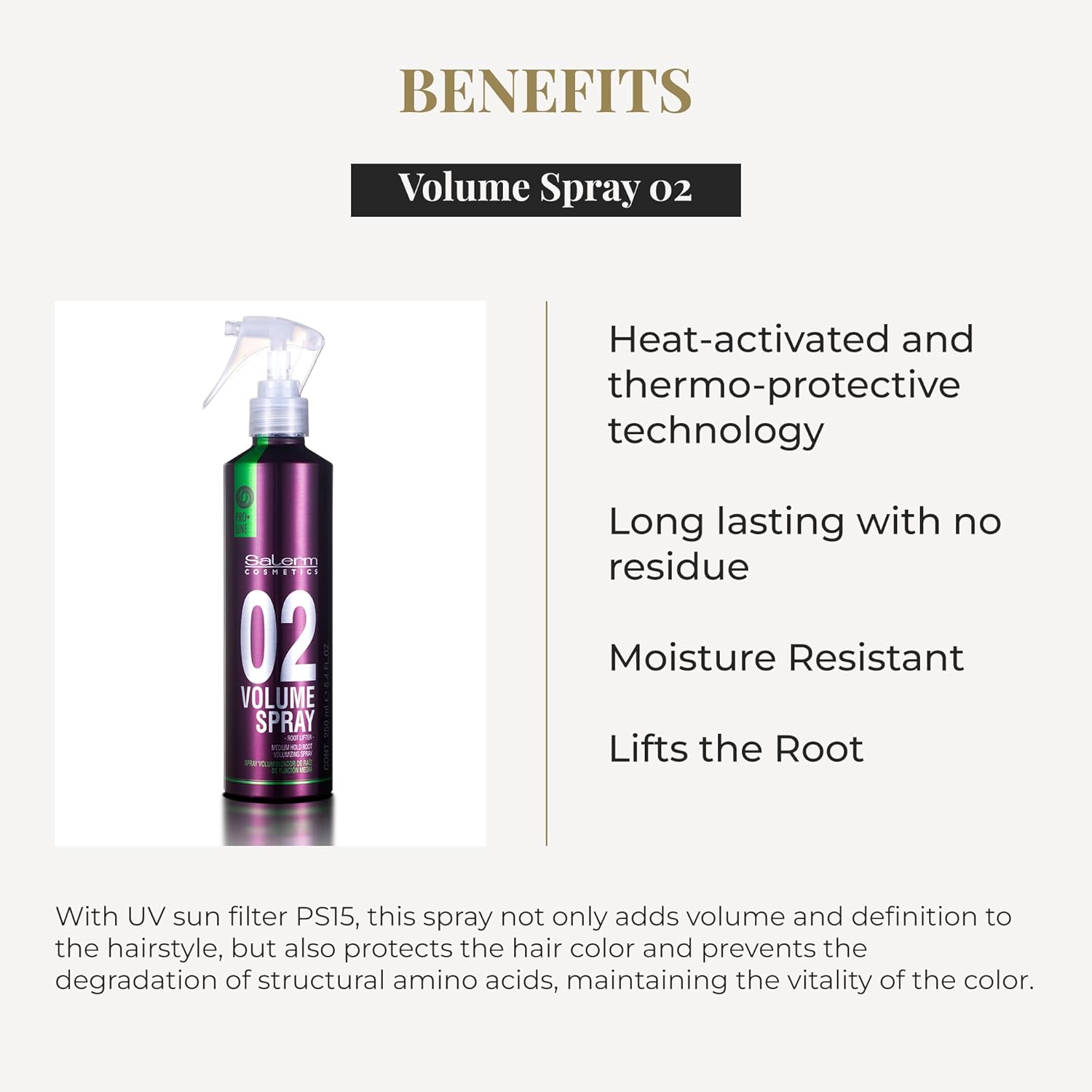 HAIR VOLUMIZER: The Volume Spray 02 is a hair volumizer that lifts the roots, adding volume without leaving residue. It also provides long-lasting hold while helping mantain the hair's vitality and shape without weighing it down