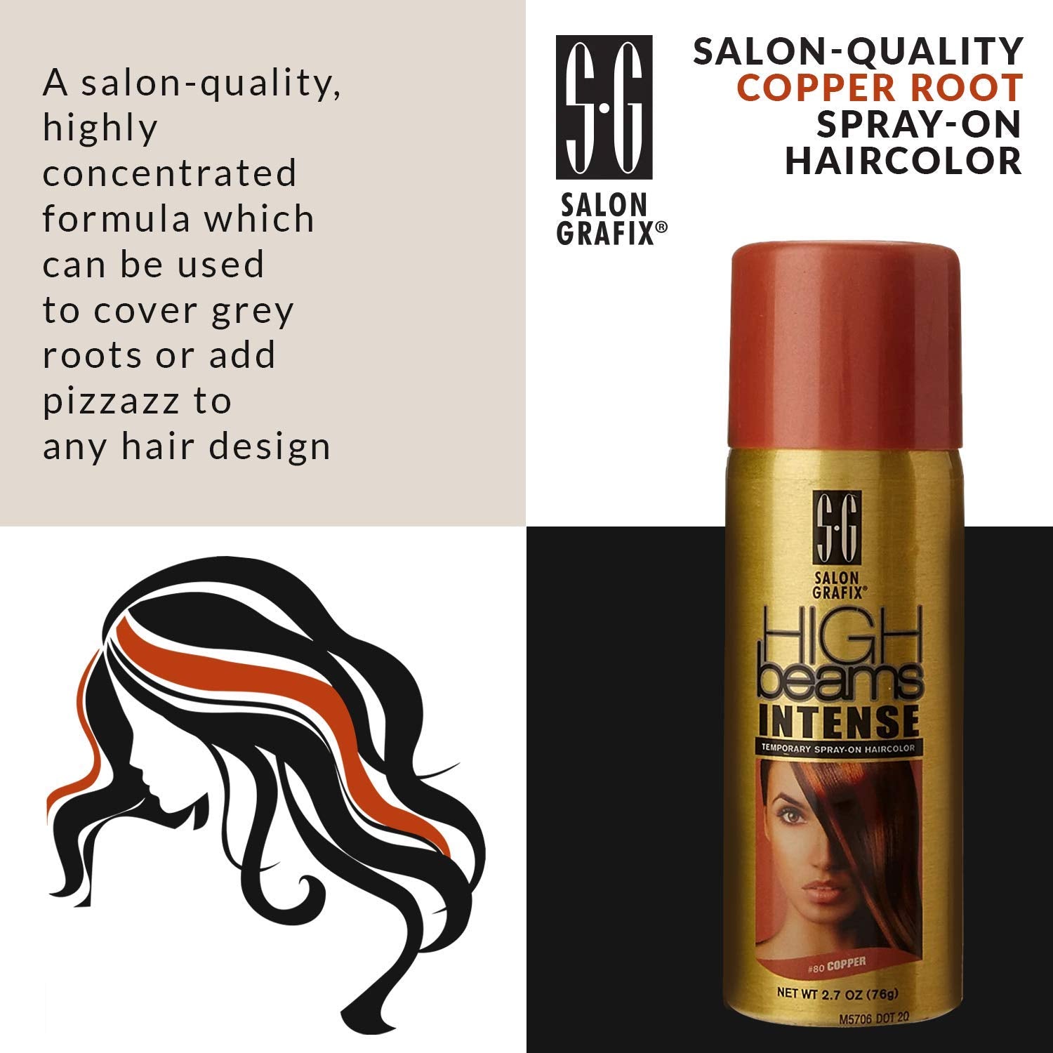 HIGH BEAMS INTENSE SPRAY ON HAIR COLOR COPPER: Salon Grafix High Beams Intense Temporary Spray-On Hair Color in Copper, is a salon-quality full coverage formula, which can be used to cover grey roots or add pizzazz to any hair design. 2.7 Oz can