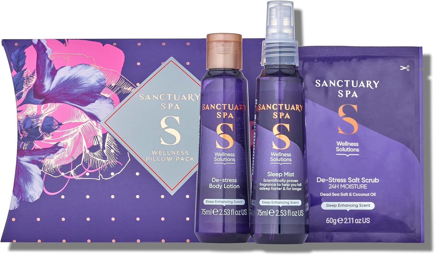 Product Description Relieve everyday pressures and stresses and enhance your wellbeing to stay calm, De-Stress and catch every ounce of sleep. Treat your mind with the advanced formulations with a scientifically proven fragrance to help you fall asleep quicker and for longer. WARMING BALM WARNING: For body only, do not use on face. On first application apply SPARINGLY. if stronger effect desired then re-apply. DO NOT USE AFTER A HOT SHOWER. Wash hands thoroughly after use. Keep away from children. Do not use if pregnant or breast feeding. Do not apply on irritated skin. Avoid sensitive areas. if sensitivity occurs rinse off. Directions To use this product, follow these steps: 1. Relieve everyday pressures and stresses enhance your wellbeing to stay calm. 2. Spritz the sleep mist lightly, 30cm away from skin or pillow. 3. Allow settle on pillow before climbing into bed. 4. Use warming balm sparingly body, avoiding face, sensitive areas, irritated skin, if pregnant breastfeeding. Wash hands thoroughly after keep children. P.when('A').execute(function(A) { A.on('a:expander:toggle_description:toggle:collapse', function(data) { window.scroll(0, data.expander.$expander[0].offsetTop-100); }); }); Safety Warning For external use only. Avoid contact with eyes. Manufacturer Contact Information PZ Cussons (Europe) Ltd., ‘C’, Ardilaun Ct., 112-114 St Stephens Green, Dublin D02 TD28, Eire. PZ Cussons Beauty LLP, Manchester M22 5TG. See more,With this relaxing gift Set from Sanctuary Spa you can relieve everyday pressures and stresses and enhance your wellbeing to stay calm, de-stress and sleep well,Sleep mist - spritz lightly 30cm away from skin or pillow,Relieve everyday pressures and stresses and enhance your wellbeing to stay calm, de-stress and catch every ounce of sleep,Treat your mind with the advanced formulations with a scientifically proven fragrance to help,Allow the mist to settle on the pillow, the climb into bed