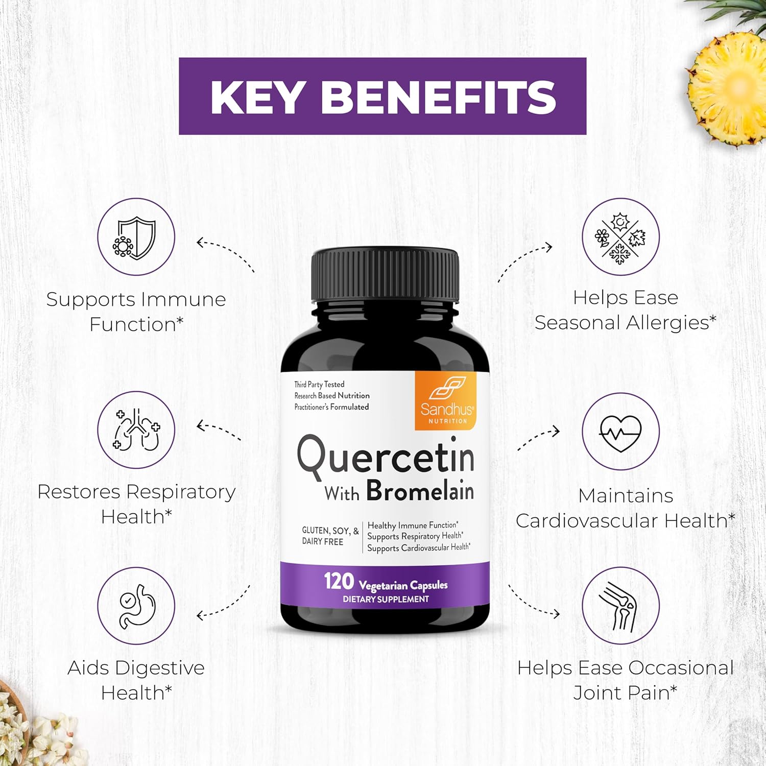 Benefits & Use: Quercetin Is An Antioxidant Bioflavonoid That Supports Immune System, Cellular Health And Cardiovascular Health, Whereas Bromelain Is A Natural Enzyme That Helps Healthy Immune And Respiratory Functions. Our Bromelain Quercetin Dihydrate Supplement Could Be A Good Alternative To The Readily Available Bromaline Supplements Containing Quercetin Bromelain Stinging Nettle, Quercetin Nettles, Bromeliad With Quercetin, Corseting With Bromelain, Standalone Quercetin 1000Mg Capsules & Other Allergy Supplements And Bioflavonoids Supplements