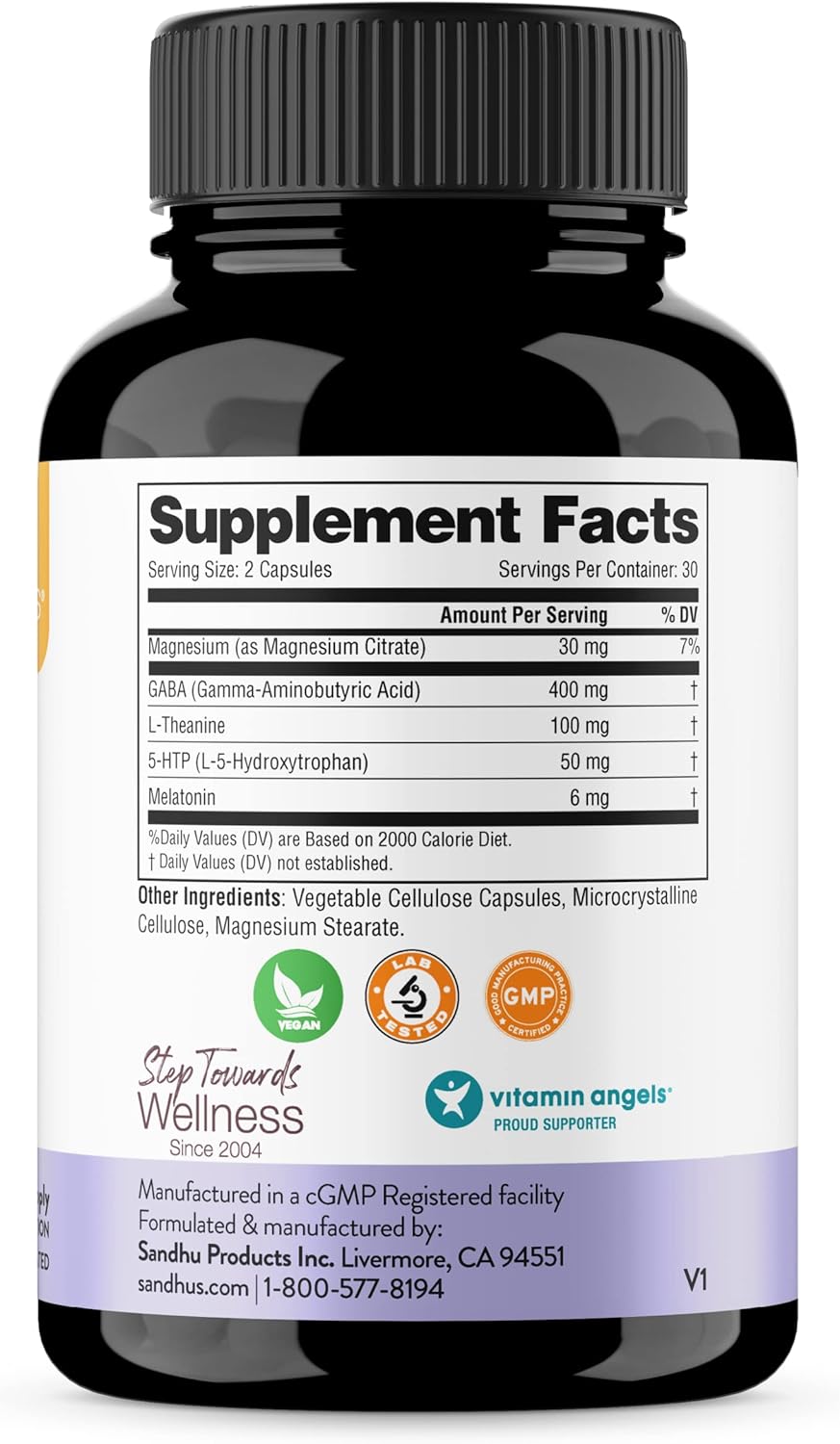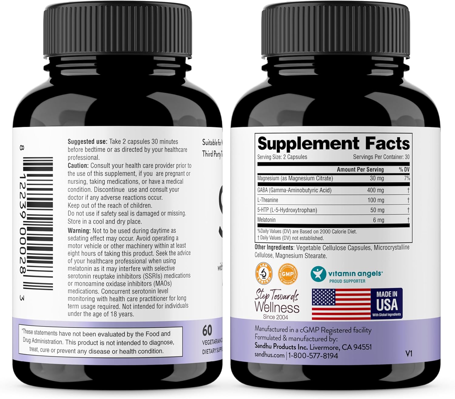About this item Sandhu’s Sleep supplement is manufactured, packed, tested, and distributed in the USA according to strict cGMP norms; One bottle offers 30 servings of magnesium citrate, GAMA, L-theanine, 5-HTP, and 6mg of melatonin for natural sleep cycle and optimal night’s sleep Fall Asleep, Stay Asleep, and Wake Up Refreshed – Melatonin helps maintain a healthy and balanced sleep cycle (sleep-wake pattern) and supports brain health, L-Theanine helps to keep you clear & focused without a groggy feeling upon morning wake up and 5-HTP supports natural sleep cycle by regulating the happy hormone Feel Calm & Relaxed – Gamma-Aminobutyric Acid (GABA) and L-Theanine help in calming your brain and preparing you for quality sleep.* Magnesium is the essential mineral that supports the transition to deep sleep by helping you with muscle and overall relaxation 100% Clean Ingredients – Science-based sleep formulation made with sleep-friendly and non-habit forming ingredients to support calm, relaxed, or restful sleep, healthy sleep/wake pattern, transition to deep sleep, morning with drowsiness, immune and brain health Pure & Quality Sleep Supplement – Sourced from reputed, branded suppliers; Our sleep supplement is vegetarian-friendly and free from gluten, soy, dairy, and nuts; Third-party tested and made in NSF-certified facility See more product details,Sandhu’s Sleep supplement is manufactured, packed, tested, and distributed in the USA according to strict cGMP norms; One bottle offers 30 servings of magnesium citrate, GAMA, L-theanine, 5-HTP, and 6mg of melatonin for natural sleep cycle and optimal night’s sleep,Fall Asleep, Stay Asleep, and Wake Up Refreshed – Melatonin helps maintain a healthy and balanced sleep cycle (sleep-wake pattern) and supports brain health, L-Theanine helps to keep you clear & focused without a groggy feeling upon morning wake up and 5-HTP supports natural sleep cycle by regulating the happy hormone,Feel Calm & Relaxed – Gamma-Aminobutyric Acid (GABA) and L-Theanine help in calming your brain and preparing you for quality sleep.* Magnesium is the essential mineral that supports the transition to deep sleep by helping you with muscle and overall relaxation,100% Clean Ingredients – Science-based sleep formulation made with sleep-friendly and non-habit forming ingredients to support calm, relaxed, or restful sleep, healthy sleep/wake pattern, transition to deep sleep, morning with drowsiness, immune and brain health,Pure & Quality Sleep Supplement – Sourced from reputed, branded suppliers; Our sleep supplement is vegetarian-friendly and free from gluten, soy, dairy, and nuts; Third-party tested and made in NSF-certified facility