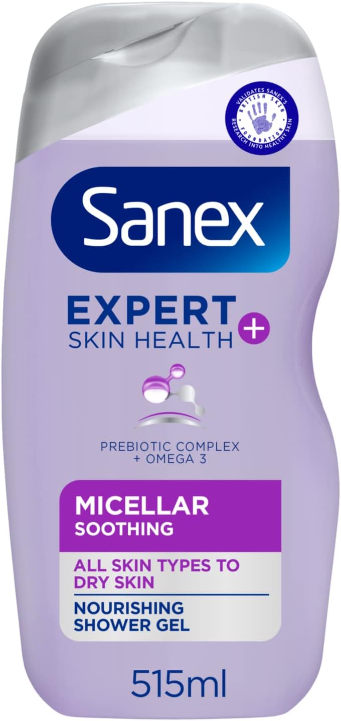 Sanex Expert Skin Health+ Micellar Soothing Shower Gel 515Ml, For Dry Skin, Body Wash For Men & Women, Nourishes Skin, Soothes Skin Tightness, 12 Hour Hydration, Prebiotic & Postbiotic Complex