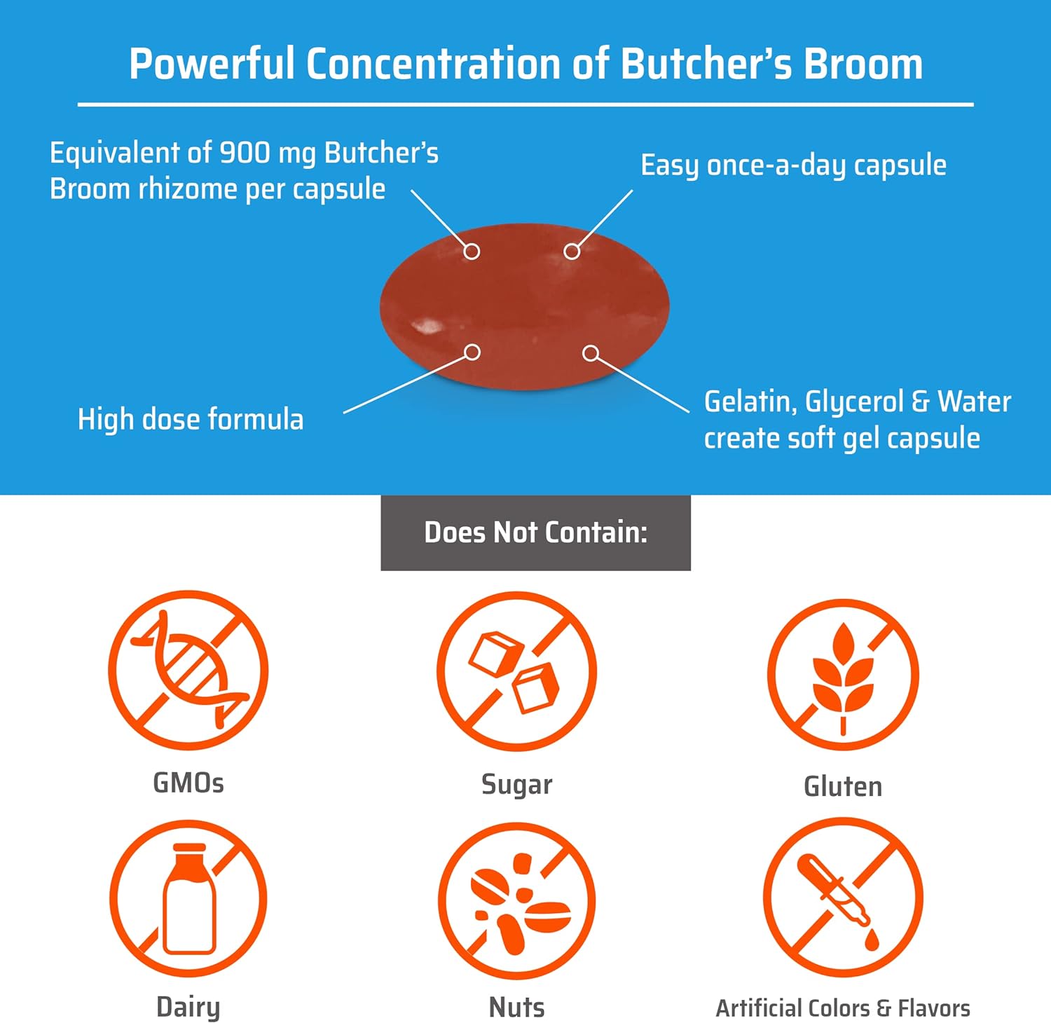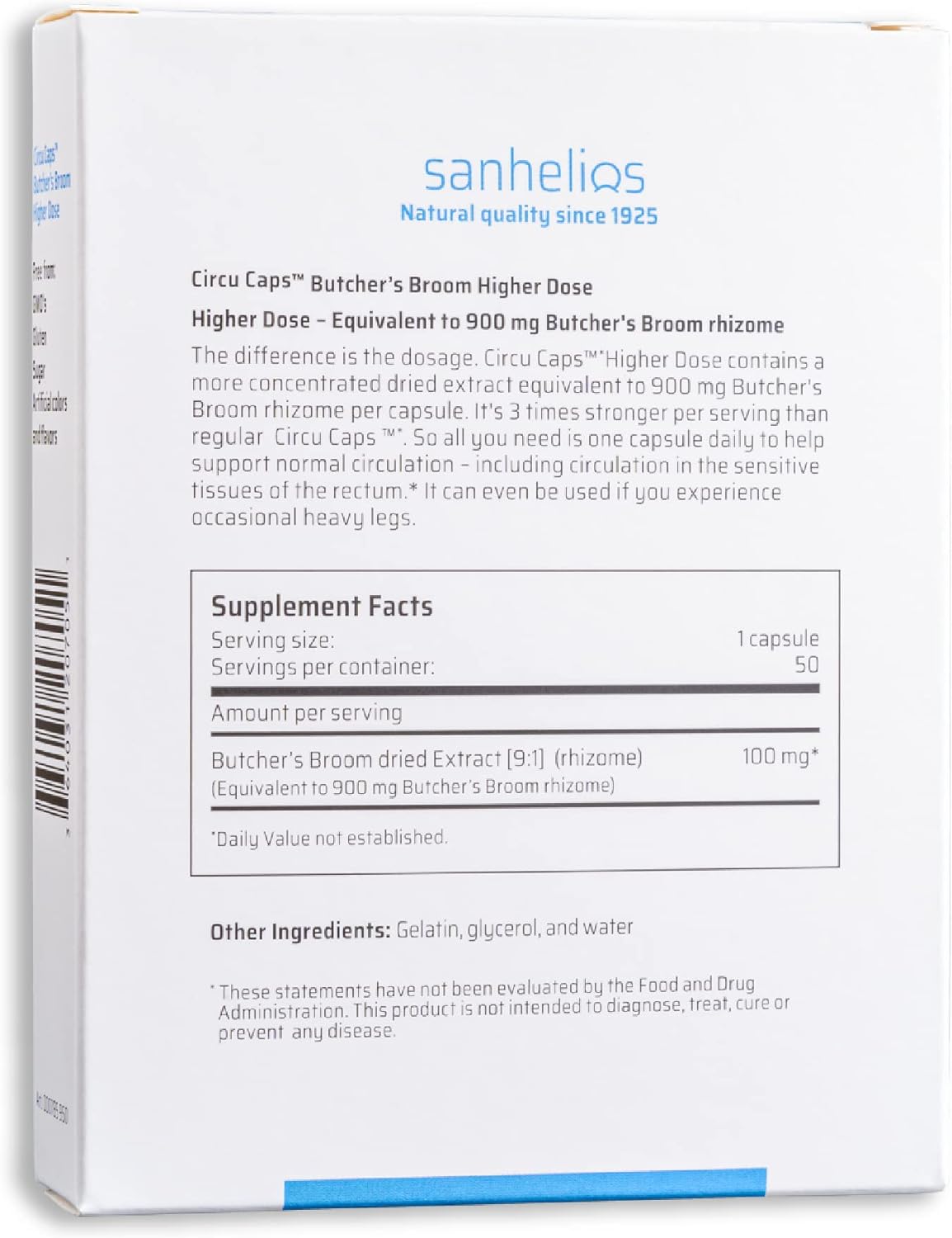 Sanhelios Circu Caps Higher Dose Max Potency Butcher's Broom Extract 100mg - Herbal Support Supplement for Healthy Blood Flow, Veins & Circulation in Legs - 50 Capsules