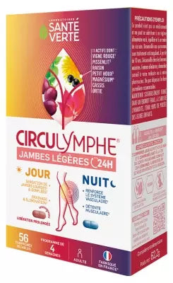 Santé Verte Circulymphe Day Night 56 Tablets Is A Food Supplement Which Is Divided Into Two Formulas (Day And Night) For A 24H Global Assumption Of Responsibility Of The Heavy Legs. Thanks To An Extended Release Technology, The Day Tablet Ensures A Gradual And Controlled Diffusion Of Active Ingredients Contributing To: Reduce The Feeling Of Heavy And Tired Legs (Nettle Leaves And Concentrated Blackcurrant Juice), Drain And Eliminate Excess Water In The Body (Dandelion Root), Provide Antioxidant