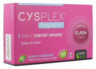 Santé Verte Cysplex 10 Sticks Is A Food Supplement Based On Plants Preparations With Sweetener Of Vegetable Origin Extract Of Stevia Leaves.It Is Indicated To Act On Urinary Comfort. This Complex Of 5 Recognized Ingredients Including Bearberry, Black Elderberry, Acacia Fibers And Cherry Tail Which Contributes To The Normal Functioning Of Urinary Elimination. In Addition, The Titrated Cranberry Extract Provides 72Mg Pac