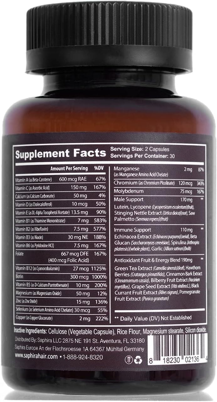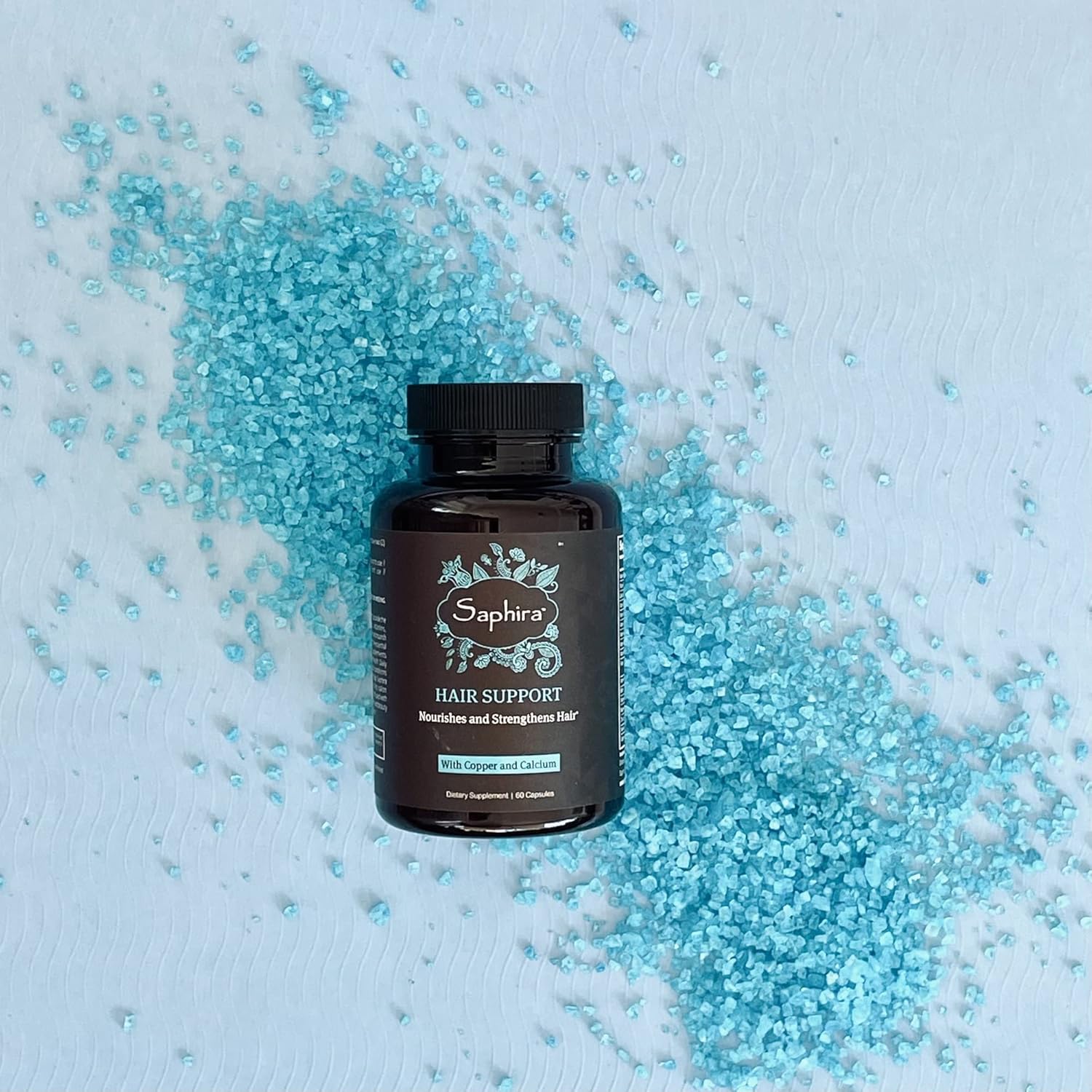 About this item Saphira Professional Hair Care Supplement Hydrating Hair Support: Promotes hair growth and boosts circulation to hair follicles which is designed to hydrate dry and damaged hair Hydrates, Supports, and Nourishes Dry and Damaged Hair: Supports healthy scalp with vitamins Copper and Calcium that when combined are essential minerals that help nourish and revive hair strands Recommended by Dermatologists: This supplement includes essential vitamins and minerals for healthy hair Including Vitamin B2, B3, B6, B12, Green Tea Extract, and Spirulina Contains Green Tea Extract and Spirulina: This supplement includes nutrients that support hair health from the inside Made in the USA with Clean Ingredients: Try Saphira Professional Hair Care's full line of hair products that are sulfate-free, paraben-free, gluten-free, vegan, and cruelty-free See more product details,Saphira Professional Hair Care Supplement Hydrating Hair Support: Promotes hair growth and boosts circulation to hair follicles which is designed to hydrate dry and damaged hair,Hydrates, Supports, and Nourishes Dry and Damaged Hair: Supports healthy scalp with vitamins Copper and Calcium that when combined are essential minerals that help nourish and revive hair strands,Recommended by Dermatologists: This supplement includes essential vitamins and minerals for healthy hair Including Vitamin B2, B3, B6, B12, Green Tea Extract, and Spirulina,Contains Green Tea Extract and Spirulina: This supplement includes nutrients that support hair health from the inside,Made in the USA with Clean Ingredients: Try Saphira Professional Hair Care's full line of hair products that are sulfate-free, paraben-free, gluten-free, vegan, and cruelty-free