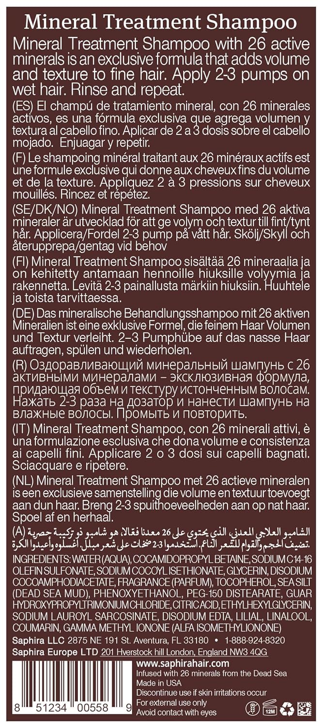 Saphira Mineral Treatment Shampoo For Fine, Thin And Color-Treated Hair, Sulfate-Free, Paraben-Free, Strengthens, Volumizes And Defines Weak And Fragile Hair