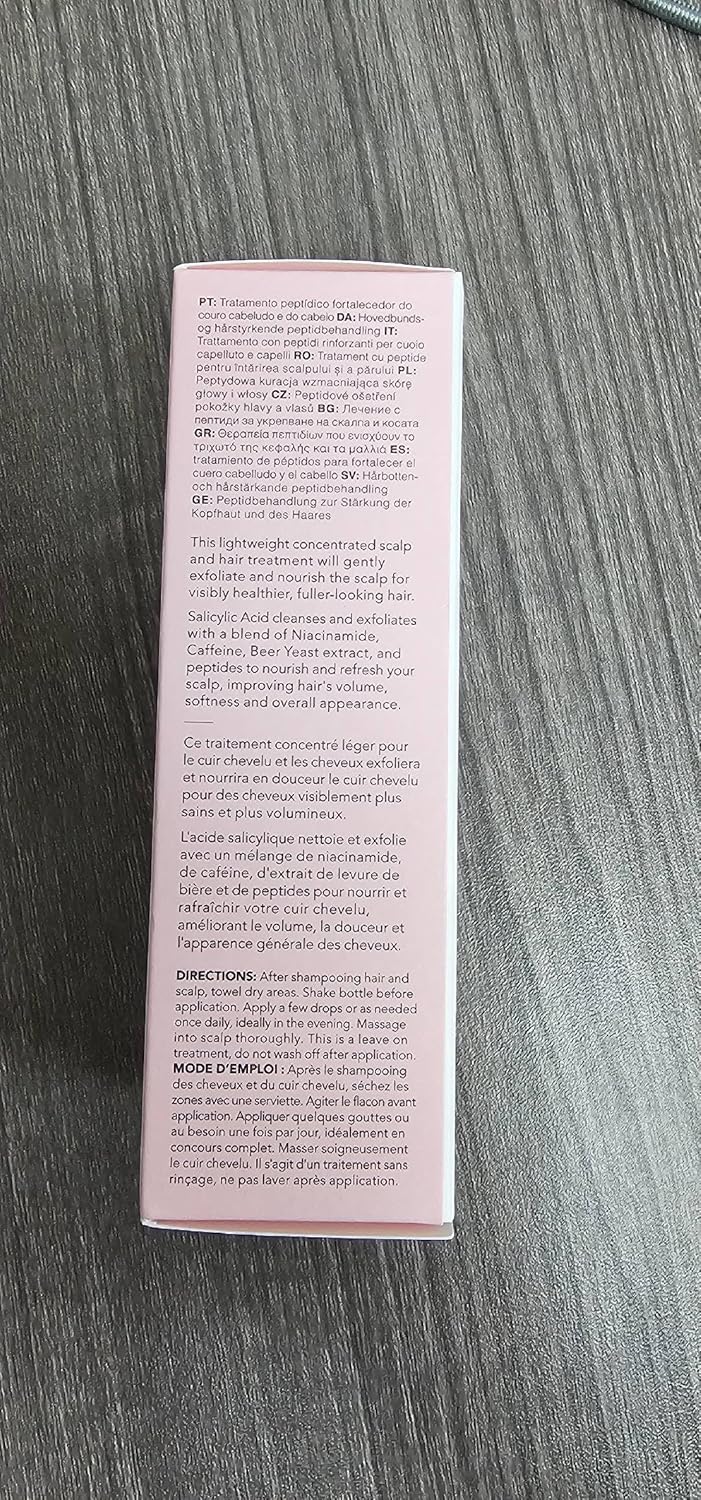About this item A lightweight, fast absorbing, non-greasy treatment with a cool refreshing sensation to add a buzz to your scalp+hair while providing nutrients and energy at the same time. Super charged with peptides, caffeine, and hop yeast to revitalize hair cell growth while additional ingredients such as Niacinamide complex, help to fortify and address hair loss. Brewed with innovative key ingredients our treatment works overnight so your hair looks pepped, nourished and awakened with vitality. KEY INGREDIENTS: Caffein: known to elongate the hair follicles and stimulate the scalp to support hair cell growth. KEY INGREDIENTS: Hop Yeast: enriches with essential vitamins and oils to address clogged scalp pores and promote hair follicles for growth. KEY INGREDIENTS: 7 Peptide Mix + Peptosome TM: Mix of 15 proprietary peptides. 7 growth factors and 8 natural skin components (collagen, keratin and NMF) DERMATOLOGIST TESTED. NO PARABENS, SULFATES, SYNTHETIC FRAGRANCE OR SYNTHETIC COLOR. See more product details,A lightweight, fast absorbing, non-greasy treatment with a cool refreshing sensation to add a buzz to your scalp+hair while providing nutrients and energy at the same time. Super charged with peptides, caffeine, and hop yeast to revitalize hair cell growth while additional ingredients such as Niacinamide complex, help to fortify and address hair loss. Brewed with innovative key ingredients our treatment works overnight so your hair looks pepped, nourished and awakened with vitality,KEY INGREDIENTS: Caffein: known to elongate the hair follicles and stimulate the scalp to support hair cell growth,KEY INGREDIENTS: Hop Yeast: enriches with essential vitamins and oils to address clogged scalp pores and promote hair follicles for growth,KEY INGREDIENTS: 7 Peptide Mix + Peptosome TM: Mix of 15 proprietary peptides. 7 growth factors and 8 natural skin components (collagen, keratin and NMF),DERMATOLOGIST TESTED. NO PARABENS, SULFATES, SYNTHETIC FRAGRANCE OR SYNTHETIC COLOR