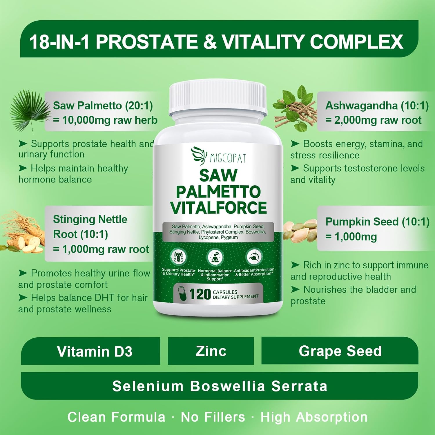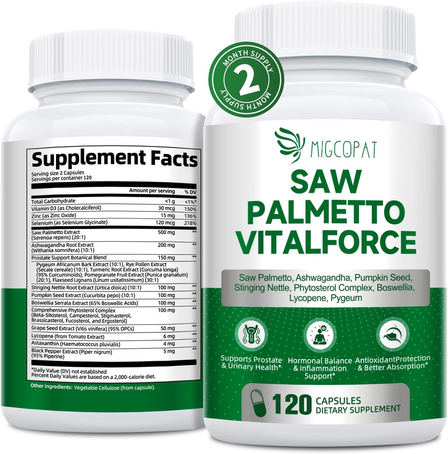Effective Prostate Health Support: Migcopat prostate health supplements each serving provides 500mg of saw palmetto extract (20:1), a well-known herb traditionally used to support prostate health, plus pygeum, pumpkin seed, and phytosterols, helps maintain healthy urinary flow and reduces nighttime bathroom tripsâcan sleep better and feel more comfortable