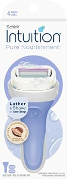 About this item NO NEED FOR SHAVING CREAM or SHAVING GEL β Lather and shave in one easy step with the Schick Intuition Pure Nourishment Razor MOISTURIZING BAR WITH COCOA BUTTER β Built-in moisturizing bar with organic cocoa butter helps soften skin as you shave CLOSE, SMOOTH SHAVE β 4 blades and pivoting head that hugs the contours of your body PERFECT FOR FIRST-TIME SHAVERS β Minimizes nicks and cuts EASY STORAGE β Stand-up cap for easy shower storage Schick Intuition Pure Nourishment Razor kit includes 1 razor handle, 1 razor cap and 2 razor blade cartridges See more product details,NO NEED FOR SHAVING CREAM or SHAVING GEL β Lather and shave in one easy step with the Schick Intuition Pure Nourishment Razor,MOISTURIZING BAR WITH COCOA BUTTER β Built-in moisturizing bar with organic cocoa butter helps soften skin as you shave,CLOSE, SMOOTH SHAVE β 4 blades and pivoting head that hugs the contours of your body,PERFECT FOR FIRST-TIME SHAVERS β Minimizes nicks and cuts,EASY STORAGE β Stand-up cap for easy shower storage,Schick Intuition Pure Nourishment Razor kit includes 1 razor handle, 1 razor cap and 2 razor blade cartridges
