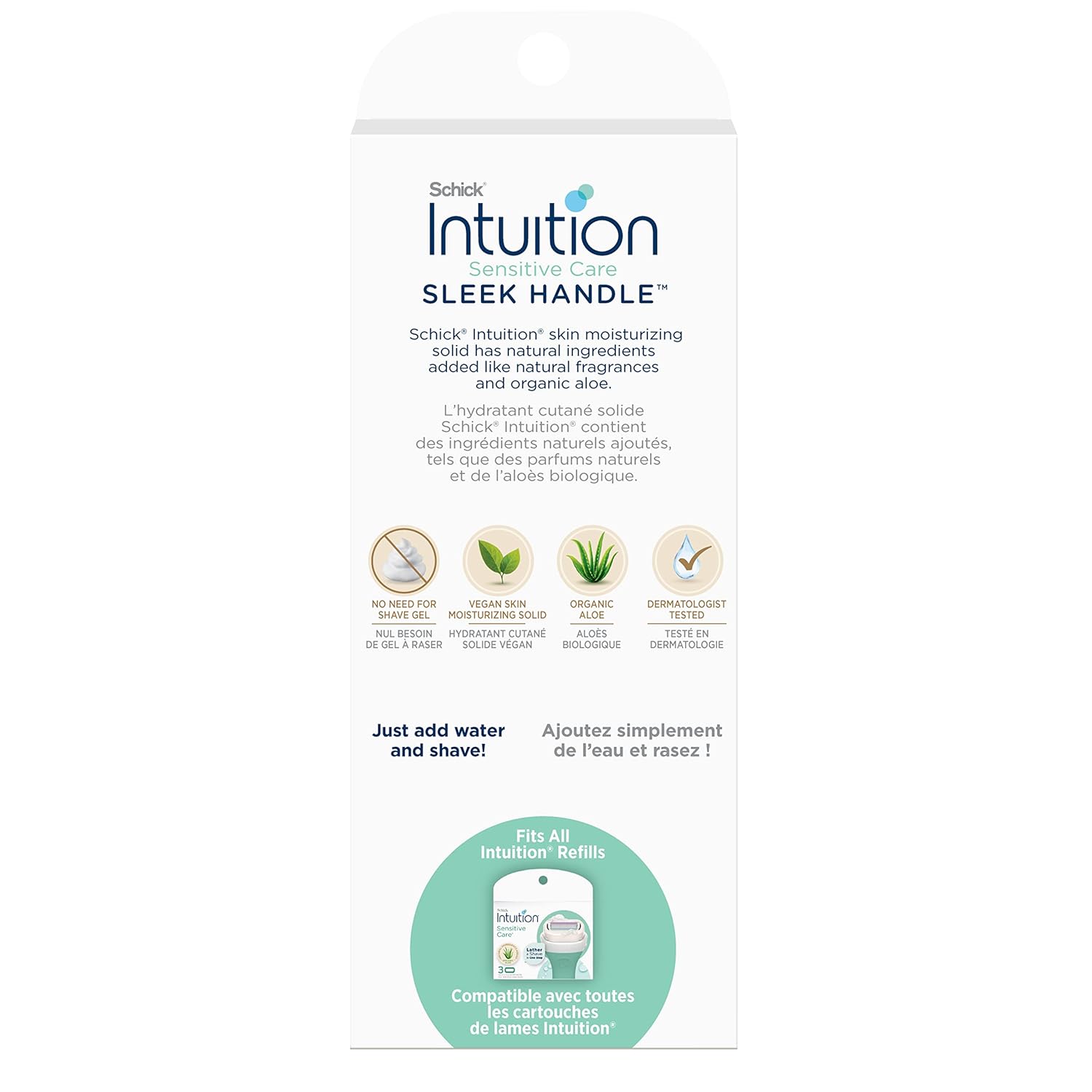 About this item NO NEED FOR SHAVING CREAM or SHAVING GEL β Lather and shave in one easy step with the Schick Intuition Sensitive Care Sleek Handle Razor SLEEK RAZOR HANDLE β Made with a slim-design handle for a comfortable grip and precise control MOISTURIZING BAR WITH ALOE β Built-in moisturizing bar with organic aloe helps soften skin as you shave DERMATOLOGIST TESTED β Vegan, hypoallergenic formula is dermatologist tested, gentle and great for sensitive skin CLOSE, SMOOTH SHAVE β 4 blades and pivoting head that hugs the contours of your body PERFECT FOR FIRST-TIME SHAVERS β Minimizes nicks and cuts See more product details,NO NEED FOR SHAVING CREAM or SHAVING GEL β Lather and shave in one easy step with the Schick Intuition Sensitive Care Sleek Handle Razor,SLEEK RAZOR HANDLE β Made with a slim-design handle for a comfortable grip and precise control,MOISTURIZING BAR WITH ALOE β Built-in moisturizing bar with organic aloe helps soften skin as you shave,DERMATOLOGIST TESTED β Vegan, hypoallergenic formula is dermatologist tested, gentle and great for sensitive skin,CLOSE, SMOOTH SHAVE β 4 blades and pivoting head that hugs the contours of your body,PERFECT FOR FIRST-TIME SHAVERS β Minimizes nicks and cuts