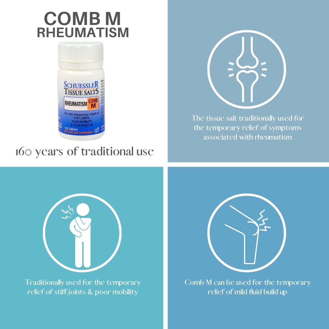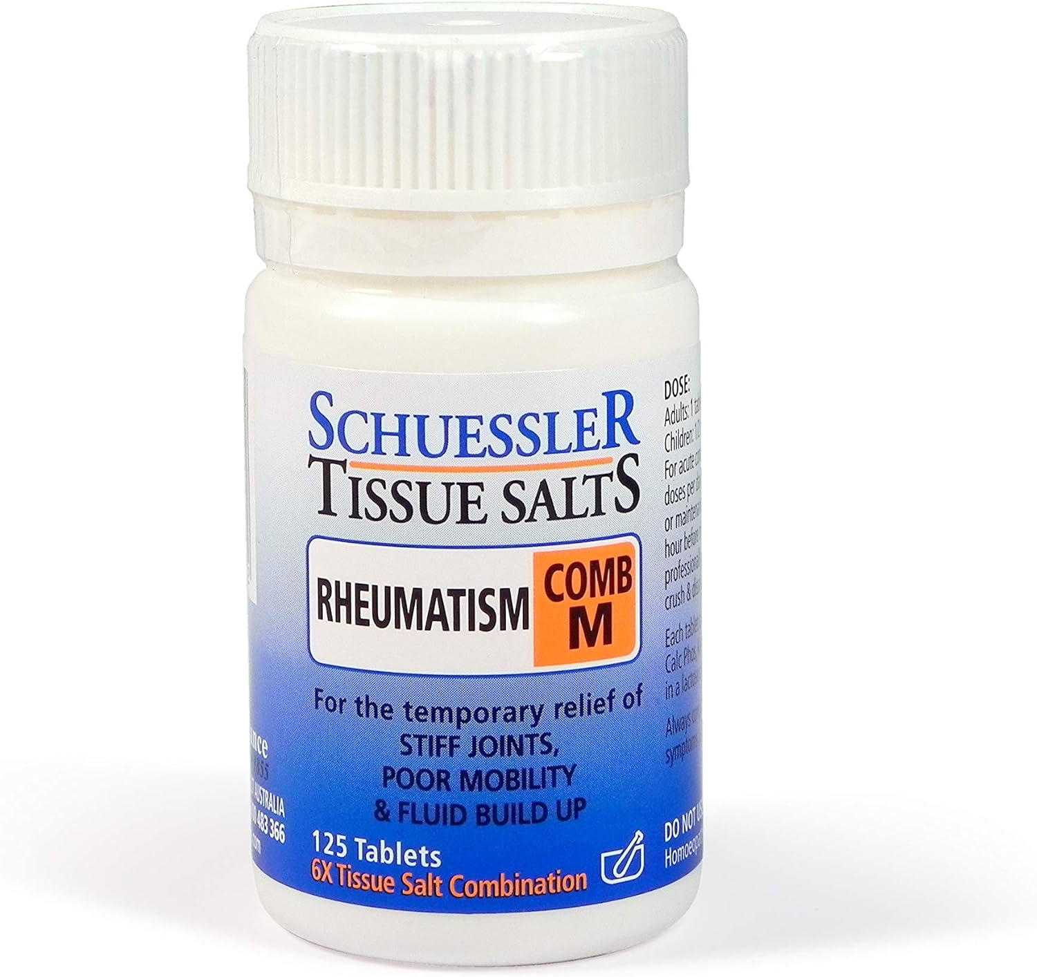 DESCRIPTION : Product Description Schuessler Tissue Salts combination M rheumatism is traditionally used for the relief from symptoms associated with stiff joints, poor mobility, fluid build up. Combination M is just such a suitable and effective home treatment. Available in 125 tablets. Ingredients EACH TABLET CONTAINS EQUAL AMOUNTS OF 6X: CALC PHOS (CALCIUM PHOSPHATE), KALI MUR (POTASSIUM CHLORIDE), NAT PHOS (SODIUM PHOSPHATE), NAT SULPH (SODIUM SULPHATE). P.when('A').execute(function(A) { A.on('a:expander:toggle_description:toggle:collapse', function(data) { window.scroll(0, data.expander.$expander[0].offsetTop-100); }); }); Directions Please refer to packaging Safety Warning Please refer to packaging Box Contains 1 x Schuessler Combination M Tissue Salts Tablets 125s See more