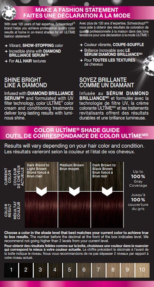 ABOUT THE PRODUCT: 1 > BRILLIANT, SHOW-STOPPING COLOR: Resists fading and remains vibrant for up to 10 weeks 2 > INFUSED WITH DIAMOND BRILLIANCE SERUM AND FORMULATED WITH SPECIAL UV FILTER TECHNOLOGY: color Ultime's color creme and conditioning treatment deliver beautiful rich color results with luminous shine from root to tip 3 > For all hair textures Make a fashion statement with color Ultime! With over 120 years of hair expertise, Schwarzkopf helps you achieve professional quality color results at home with 23 on-trend shades for an ULTIME fashion statement!