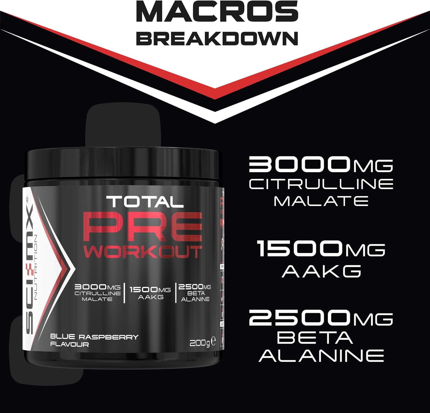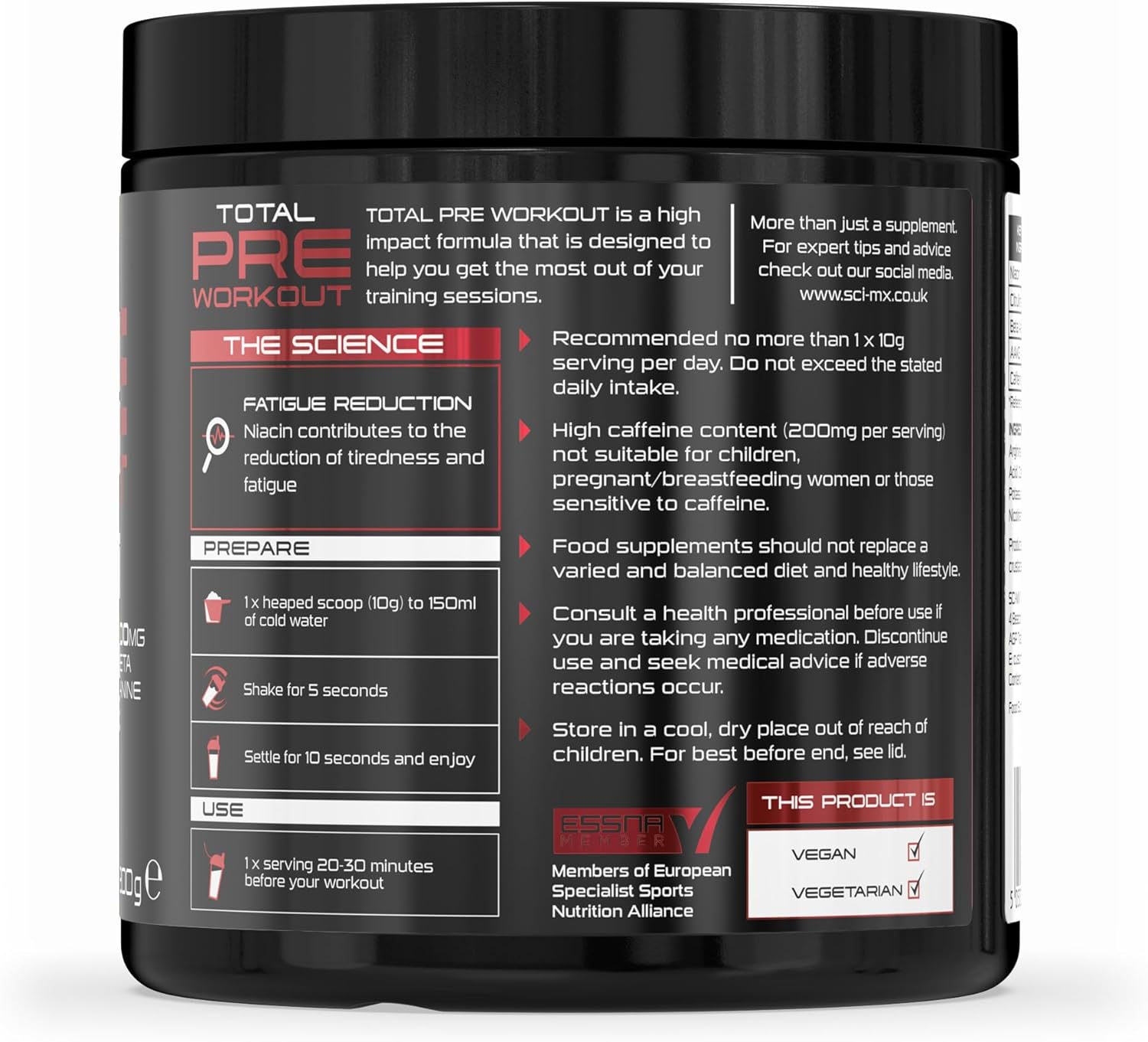 Sci-Mx - Total Pre Workout - Blue Raspberry Flavour - 2500Mg Beta Alanine • 3000Mg Citrulline Malate • 200Mg Caffeine • Niacin For Fatigue - 200G