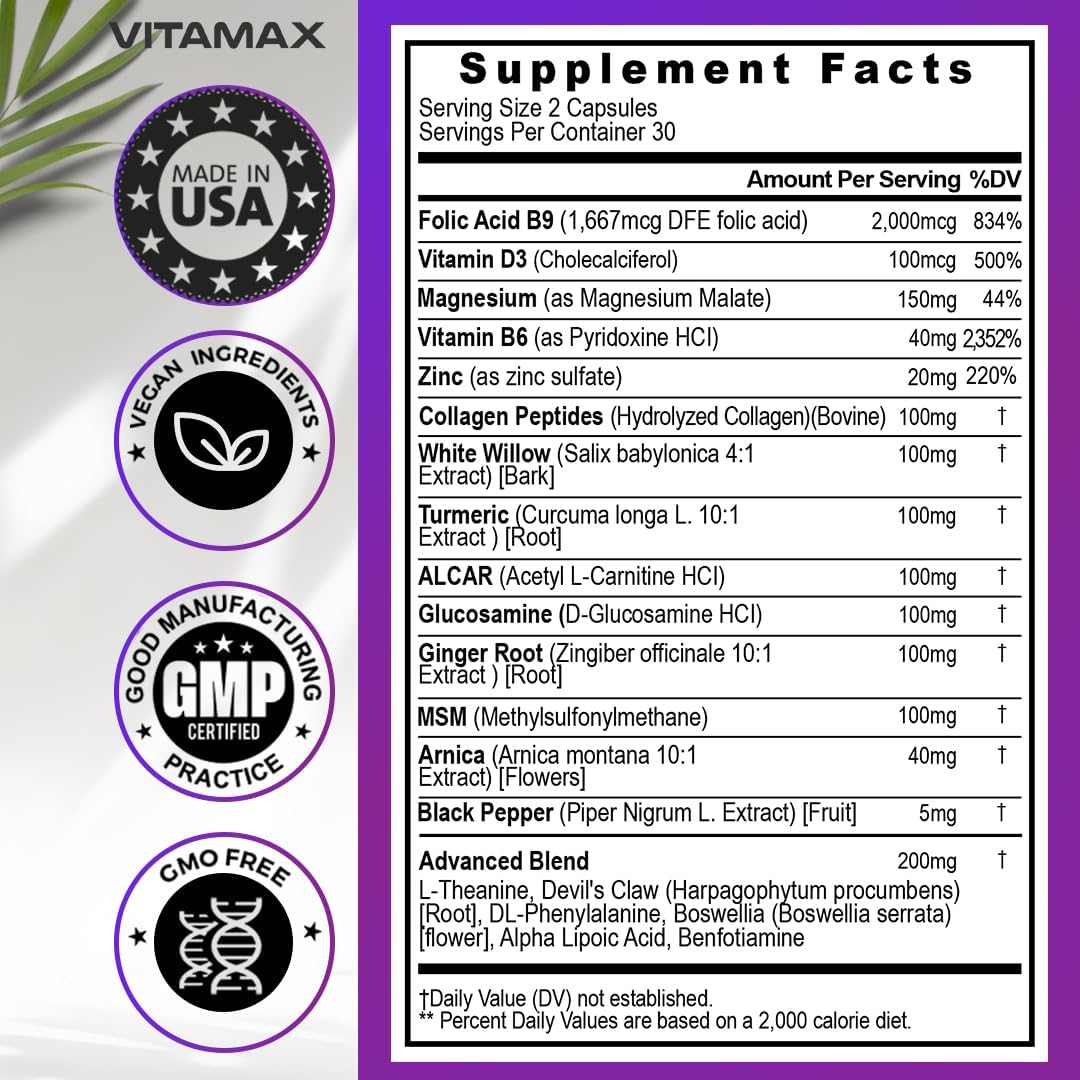 About this item Packed Relief Driven Vitamins and Minerals : Every serving of Nerve-Plus is a rich source of 20 vital nutrients, including Alpha Lipoic Acid, MSM, Magnesium, Arnica, Turmeric, Vitamin B6, Vitamin B9, and Glucosamine all in one supplement capsules. We prioritize natural ingredients, carefully sourced from sustainable and environmentally conscious farms, guaranteeing that only the finest, market-leading ingredients make it into our product. Relieving Sciatic Nerve Discomfort: Nerve Plus offers targeted relief for hip, butt, leg, and lower back discomfort associated with sciatic nerve issues. Take two capsules in the morning and evening with meals for best results. A 30-day regimen is recommended for maximum benefits. Nerve Plus Comprehensive Relief: Through its unique blend of ingredients, including Collagen Peptides, ALCAR, Zinc, Benfotiamine, Ginger Root, Vitamin D3, and L-Theanine. This all-in-one supplement capsule is for both men and women, providing a convenient solution to address multiple aspects of well-being. Instant relief ingredients target discomfort at the source. Enhanced Nerve Function: Nerve Plus contains key nutrients like Boswellia, DL-Phenylalanine, White Willow, Devil's Claw, Vitamin B6, Vitamin B9, and L-Theanine to support healthy nerve function. Additionally, Glucosamine and Collagen Peptides promote joint health for improved mobility. Premium Quality by Never Compromising: Formulated and Made in the USA by industry-leading professionals from start to finish. Proudly manufactured in a cGMP state-of-the-art facility, all products are tested for purity and potency and are always vegan and cruelty-free. See more product details,Packed Relief Driven Vitamins and Minerals : Every serving of Nerve-Plus is a rich source of 20 vital nutrients, including Alpha Lipoic Acid, MSM, Magnesium, Arnica, Turmeric, Vitamin B6, Vitamin B9, and Glucosamine all in one supplement capsules. We prioritize natural ingredients, carefully sourced from sustainable and environmentally conscious farms, guaranteeing that only the finest, market-leading ingredients make it into our product,Relieving Sciatic Nerve Discomfort: Nerve Plus offers targeted relief for hip, butt, leg, and lower back discomfort associated with sciatic nerve issues. Take two capsules in the morning and evening with meals for best results. A 30-day regimen is recommended for maximum benefits,Nerve Plus Comprehensive Relief: Through its unique blend of ingredients, including Collagen Peptides, ALCAR, Zinc, Benfotiamine, Ginger Root, Vitamin D3, and L-Theanine. This all-in-one supplement capsule is for both men and women, providing a convenient solution to address multiple aspects of well-being. Instant relief ingredients target discomfort at the source,Enhanced Nerve Function: Nerve Plus contains key nutrients like Boswellia, DL-Phenylalanine, White Willow, Devil's Claw, Vitamin B6, Vitamin B9, and L-Theanine to support healthy nerve function. Additionally, Glucosamine and Collagen Peptides promote joint health for improved mobility,Premium Quality by Never Compromising: Formulated and Made in the USA by industry-leading professionals from start to finish. Proudly manufactured in a cGMP state-of-the-art facility, all products are tested for purity and potency and are always vegan and cruelty-free