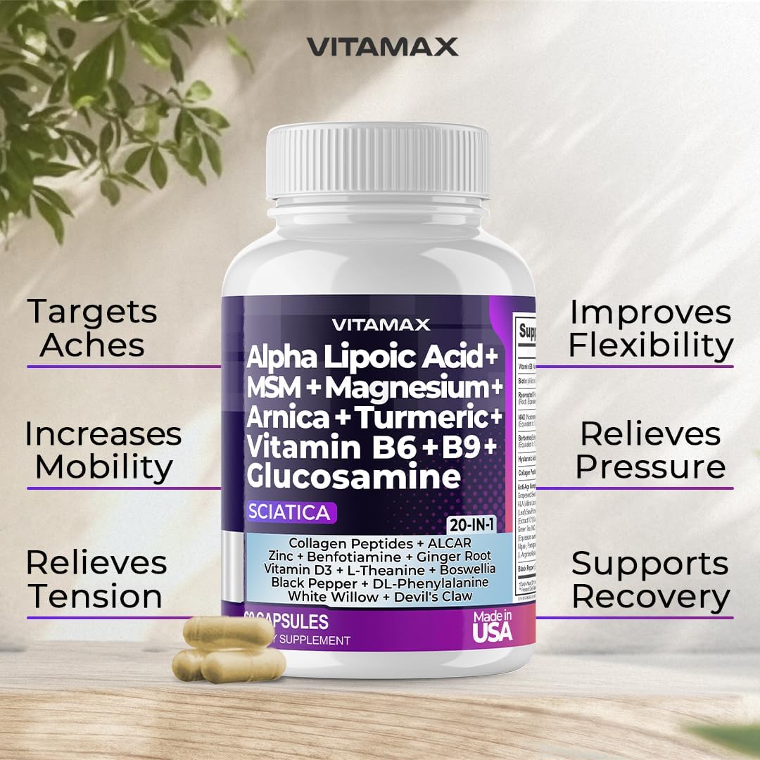 Sciatic Nerve Health Support - Sciatic Nerve Supplement Capsules With Folic Acid, Pea, Glucosamine, Msm, Vitamin B Complex, Alpha Lipoic Acid 300Mg – 60Ct – Made In Usa