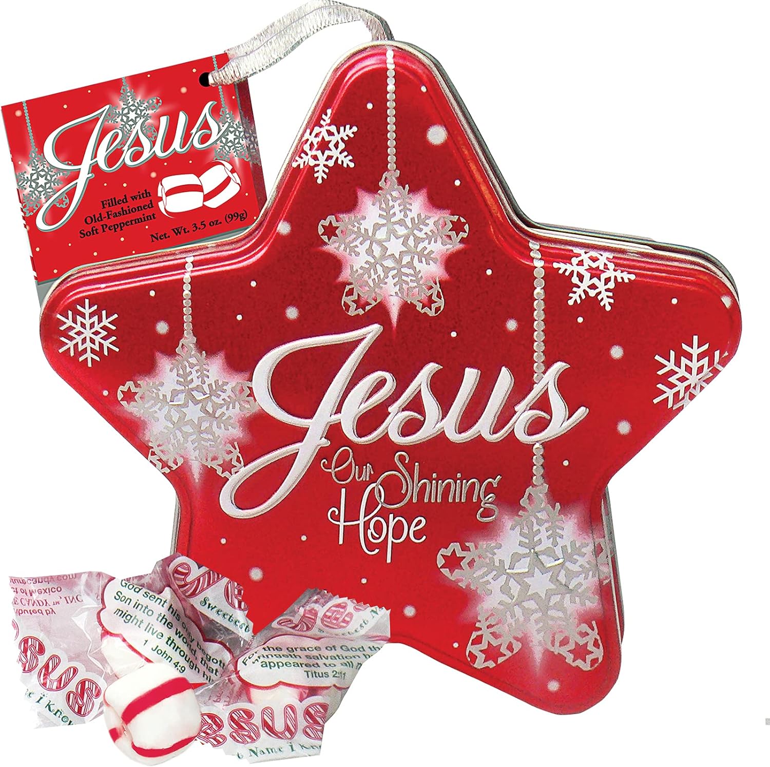 Scripture Candy, Jesus Our Shining Hope Red Ornament Star Tin With Old-Fashioned Soft Peppermint