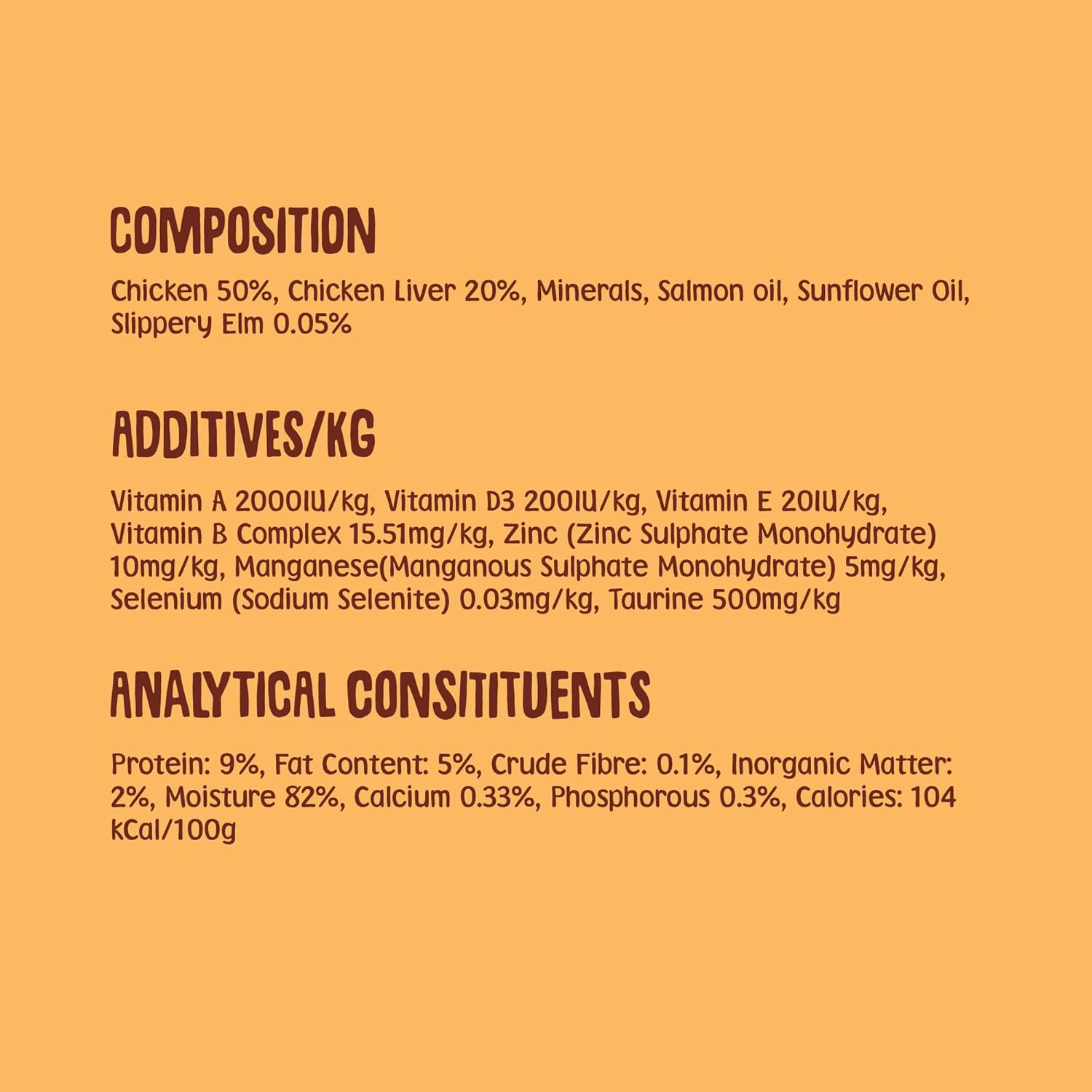 Product Description This wet cat food pack has 18 x 80g portions of our most popular pate, chicken. Packed with 70 Percent meat our wet cat food are complete recipes with everything your cat needs to stay healthy including essential taurine for heart and eye health. Designed to be gentle for sensitive stomachs and maintaining our digestive health ethos, we include wholesome ingredients and Slippery Elm. Taste approved by our cat Boo, we hope this nutritious meal tickles your cat's tastebuds. Indications Healthy adult cats (4kg) need three 80g cans each day. P.when('A').execute(function(A) { A.on('a:expander:toggle_description:toggle:collapse', function(data) { window.scroll(0, data.expander.$expander[0].offsetTop-100); }); }); Ingredients Chicken 50%, Chicken Liver 20%, Minerals, Salmon oil, Sunflower Oil, Slippery Elm 0.05% 941.3 kcal/kg Directions Healthy adult cats (4kg) need three 80g cans each day. See more