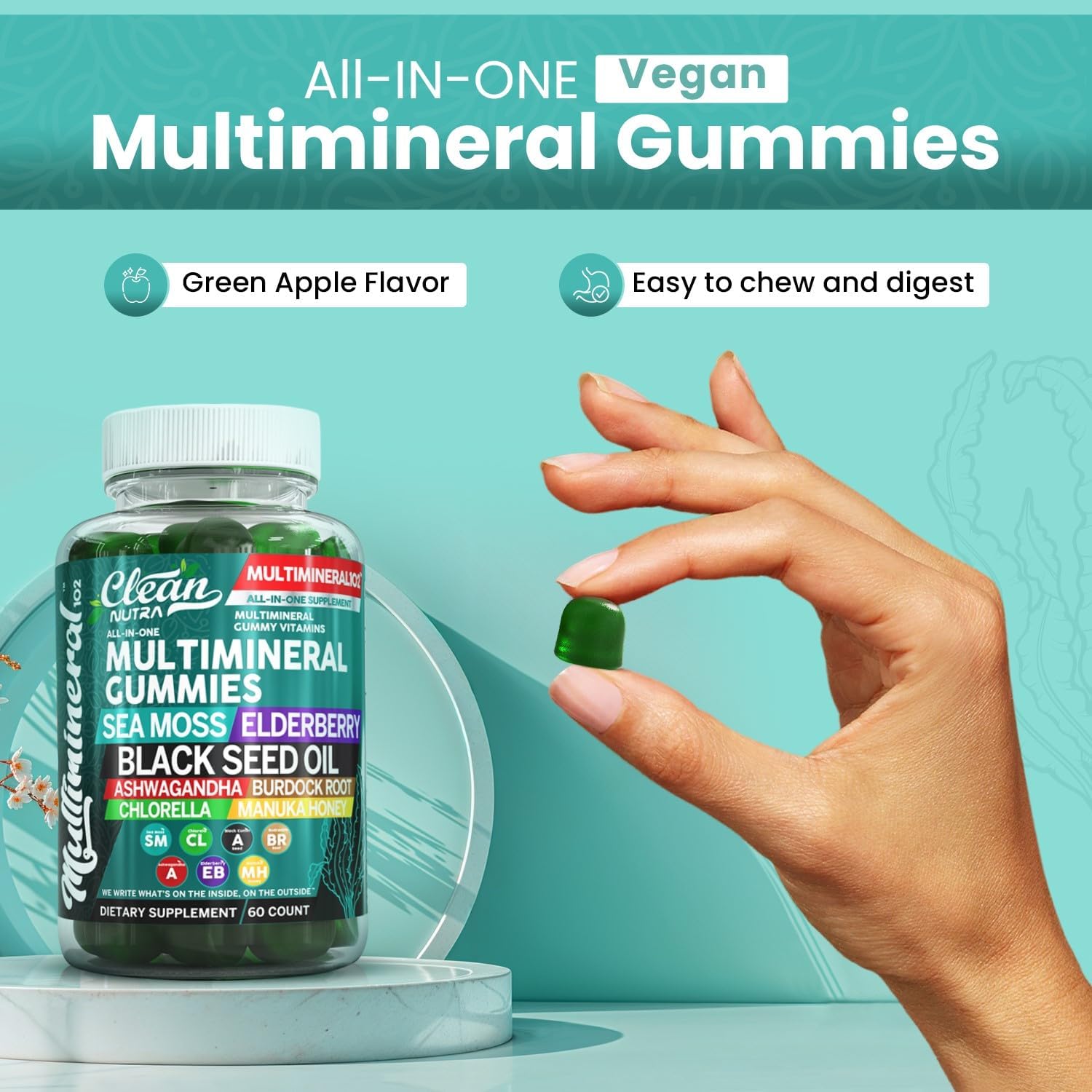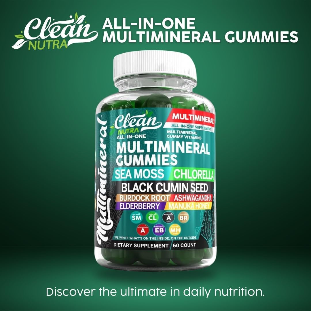 Introducing Clean Nutra'S Sea Moss Multimineral Gummies, A Meticulously Formulated All In One Vitamin For Men And Women, Designed To Support Your Overall Well-Being. These Gummies Provide A Comprehensive Blend Of Sea Moss, Black Seed Oil Gummies, Elderberry Capsules In Gummy Form, Ashwagandha Extra Strength, Burdock Root Powder, Chlorella Organic, And Manuka Honey. Each Gummy Vitamins For Women And Men Are Infused With Multiminerals To Support Various Health Benefits. Sea Moss Supplement, Renowned For Its Rich Nutrient Profile, Is Coupled With Black Seed Oil Organic Cold Pressed Capsules In Gummy, Known For Its Potent Properties, And Elderberry Gummies For Adults, Which Has Long Been Used To Support Immune Health And Gut Health For Women. Organic Ashwagandha, A Versatile Adaptogen, Is Included To Aid In Maintaining A Balanced Response To Everyday Health Needs. Burdock Root Tincture And Chlorella Supplement Offer Additional Benefits, Contributing To Vitality And Overall Health. These Gummies Also Contain Manuka Honey, Celebrated For Its Unique Properties, To Give You A Well-Rounded Supplement. Perfect For Those Seeking A Holistic Approach To Health, Our Sea Moss Ashwagandha Multimineral Gummies Cater To Various Needs, Making Them Suitable For Adults And Children Alike. Incorporate Clean Nutra'S Vegan Gummies Into Your Daily Regimen And Experience The Convenience Of An All In One Supplement Sea Moss. These Gummies Not Only Provide Kids Immune Support But Also Contribute As Women Health Vitamins And Support Overall Wellness For Men