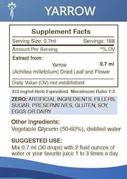 Secrets Of The Tribe Yarrow Alcohol-Free Liquid Extract, Yarrow (Achillea Millefolium) Dried Leaf And Flower Tincture Supplement (4 Fl Oz)