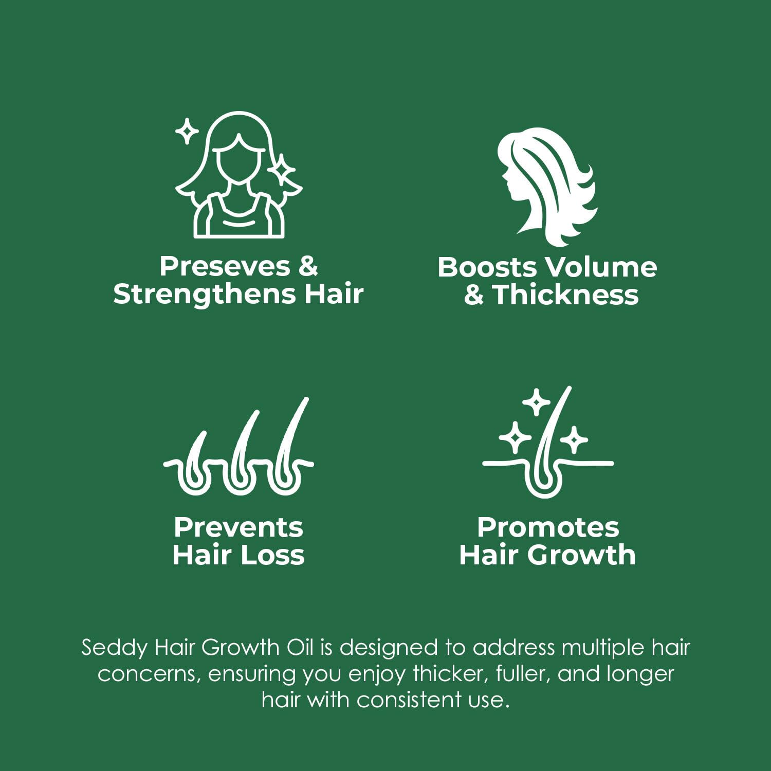 Thicker, Fuller, Longer Hair: Discover the magic of Seddy Natural Hair Growth Oil—an all-in-one solution for thicker, fuller, and longer hair. Our chemical-free formula harnesses the power of natural ingredients, ensuring your hair receives the care it deserves for optimal growth and vitality
