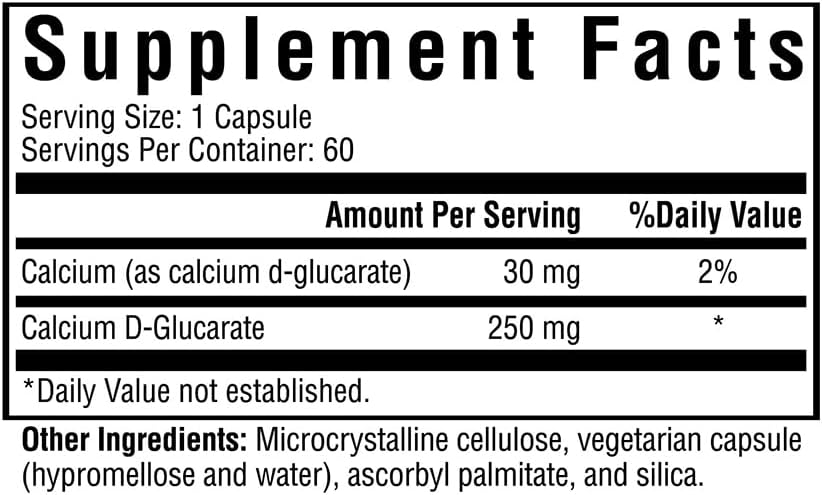 BULLET POINTS : 1 > Targeted support: Provides 250 mg of calcium D-glucarate, a calcium salt of D-glucaric acid, in each vegetarian capsule. Calcium D-Glucarate is thought to help support healthy phase II liver detoxification processes and may also help support healthy estrogen metabolism
