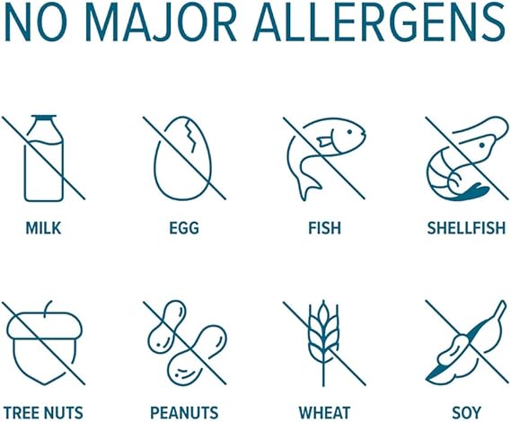 Free from: Eggs, fish, gluten, GMO, milk, peanuts, shellfish, soy, sesame, tree nuts, wheat, artificial colors, artificial flavors, and artificial preservatives