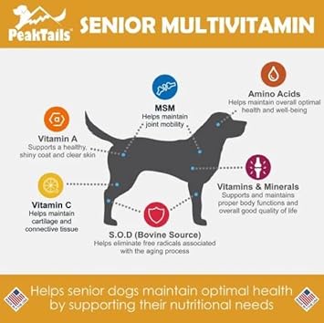 About this item Supports Joint Health: Formulated with OptiMSM to help maintain joint function and mobility in senior dogs. Supports Immune Function: Includes Superoxide Dismutase and buffered vitamin C to support the immune system and help manage oxidative stress. Comprehensive Nutritional Support: Provides 19 essential vitamins and minerals to support the overall nutritional needs of aging dogs. High-Quality Ingredients: Made with premium ingredients for better absorption and effectiveness. Manufactured in the USA for safety and quality. Tasty & Treat-Like Experience: Tablets are tasty and provide a treat-like experience for your dog, ensuring a hassle-free supplementation routine. See more product details,Supports Joint Health: Formulated with OptiMSM to help maintain joint function and mobility in senior dogs,Supports Immune Function: Includes Superoxide Dismutase and buffered vitamin C to support the immune system and help manage oxidative stress,Comprehensive Nutritional Support: Provides 19 essential vitamins and minerals to support the overall nutritional needs of aging dogs,High-Quality Ingredients: Made with premium ingredients for better absorption and effectiveness. Manufactured in the USA for safety and quality,Tasty & Treat-Like Experience: Tablets are tasty and provide a treat-like experience for your dog, ensuring a hassle-free supplementation routine