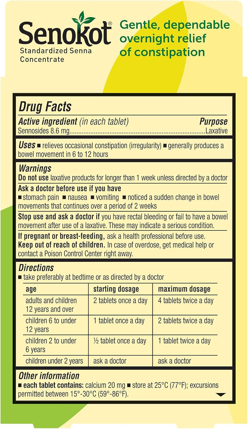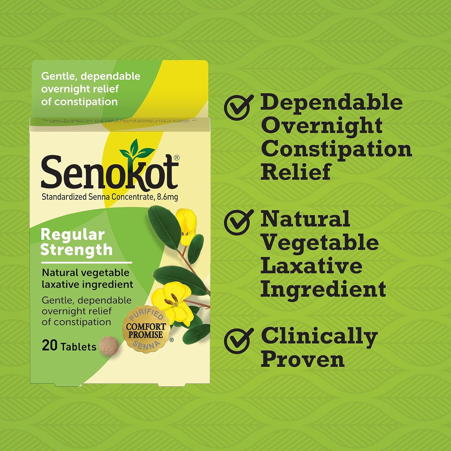 About this item GENTLE, DEPENDABLE, OVERNIGHT RELIEF. Senokot Regular Strength laxative tablets use a standardized senna concentrate to provide gentle, overnight relief from occasional constipation. Can be used in children ages 2+. CLINICALLY PROVEN. Senokot Regular Strength Laxative Tablets provide gentle, overnight relief from occasional constipation using a natural vegetable laxative ingredients. Use for treating occasional constipation. NATURAL VEGETABLE LAXATIVE INGREDIENT. For your comfort, the active ingredient in Senokot Regular Strength Laxative Tablets is purified senna, manufactured to high quality standards. For dependable overnight relief from occasional constipation. HELPS RELIEVE OCCASIONAL CONSTIPATION. Senokot Regular Strength Laxative Tablets contain a natural vegetable laxative ingredient. Senokot Regular Strength tablets can be used in children ages 2+. DEPENDABLE RELIEF. Like all Senokot Laxative products, Senokot Regular Strength Laxative Tablets are produced from the natural vegetable laxative ingredient senna, providing dependable, gentle, overnight relief from occasional constipation. See more product details,GENTLE, DEPENDABLE, OVERNIGHT RELIEF. Senokot Regular Strength laxative tablets use a standardized senna concentrate to provide gentle, overnight relief from occasional constipation. Can be used in children ages 2+,CLINICALLY PROVEN. Senokot Regular Strength Laxative Tablets provide gentle, overnight relief from occasional constipation using a natural vegetable laxative ingredients. Use for treating occasional constipation,NATURAL VEGETABLE LAXATIVE INGREDIENT. For your comfort, the active ingredient in Senokot Regular Strength Laxative Tablets is purified senna, manufactured to high quality standards. For dependable overnight relief from occasional constipation,HELPS RELIEVE OCCASIONAL CONSTIPATION. Senokot Regular Strength Laxative Tablets contain a natural vegetable laxative ingredient. Senokot Regular Strength tablets can be used in children ages 2+,DEPENDABLE RELIEF. Like all Senokot Laxative products, Senokot Regular Strength Laxative Tablets are produced from the natural vegetable laxative ingredient senna, providing dependable, gentle, overnight relief from occasional constipation