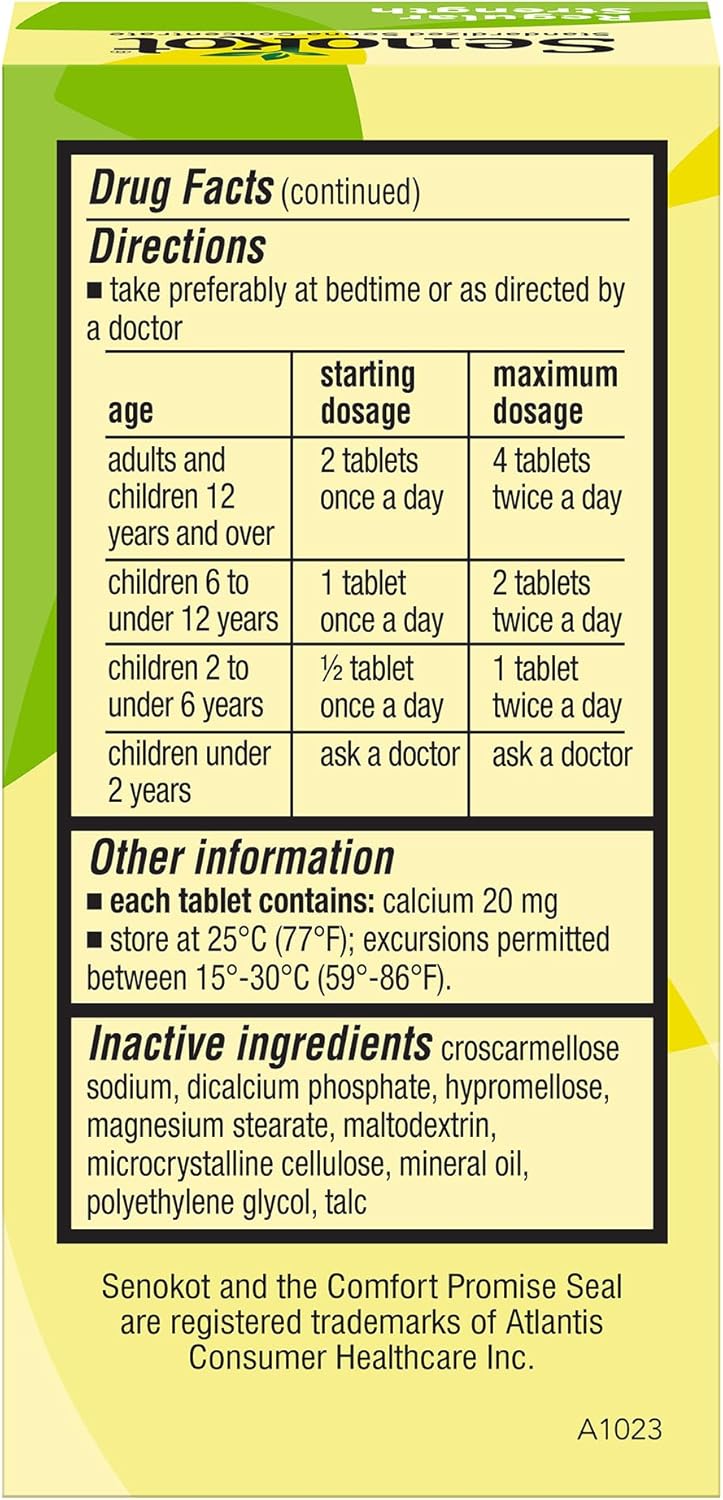 About this item GENTLE, DEPENDABLE, OVERNIGHT RELIEF. Senokot Regular Strength laxative tablets use a standardized senna concentrate to provide gentle, overnight relief from occasional constipation. Can be used in children ages 2+. CLINICALLY PROVEN. Senokot Regular Strength Laxative Tablets provide gentle, overnight relief from occasional constipation using a natural vegetable laxative ingredients. Use for treating occasional constipation. NATURAL VEGETABLE LAXATIVE INGREDIENT. For your comfort, the active ingredient in Senokot Regular Strength Laxative Tablets is purified senna, manufactured to high quality standards. For dependable overnight relief from occasional constipation. HELPS RELIEVE OCCASIONAL CONSTIPATION. Senokot Regular Strength Laxative Tablets contain a natural vegetable laxative ingredient. Senokot Regular Strength tablets can be used in children ages 2+. DEPENDABLE RELIEF. Like all Senokot Laxative products, Senokot Regular Strength Laxative Tablets are produced from the natural vegetable laxative ingredient senna, providing dependable, gentle, overnight relief from occasional constipation. See more product details,GENTLE, DEPENDABLE, OVERNIGHT RELIEF. Senokot Regular Strength laxative tablets use a standardized senna concentrate to provide gentle, overnight relief from occasional constipation. Can be used in children ages 2+,CLINICALLY PROVEN. Senokot Regular Strength Laxative Tablets provide gentle, overnight relief from occasional constipation using a natural vegetable laxative ingredients. Use for treating occasional constipation,NATURAL VEGETABLE LAXATIVE INGREDIENT. For your comfort, the active ingredient in Senokot Regular Strength Laxative Tablets is purified senna, manufactured to high quality standards. For dependable overnight relief from occasional constipation,HELPS RELIEVE OCCASIONAL CONSTIPATION. Senokot Regular Strength Laxative Tablets contain a natural vegetable laxative ingredient. Senokot Regular Strength tablets can be used in children ages 2+,DEPENDABLE RELIEF. Like all Senokot Laxative products, Senokot Regular Strength Laxative Tablets are produced from the natural vegetable laxative ingredient senna, providing dependable, gentle, overnight relief from occasional constipation