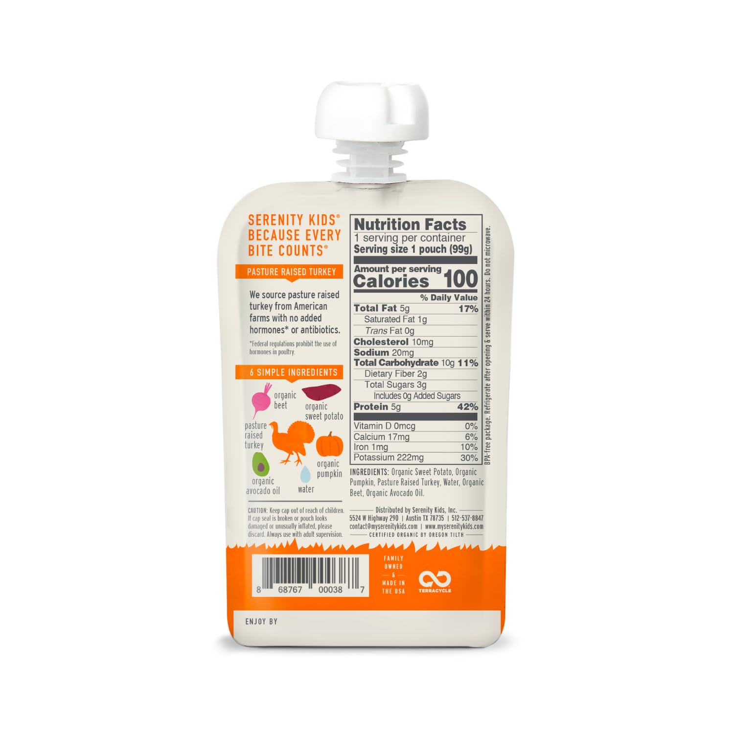 Serenity Kids 6+ Months Baby Food Pouches Puree Made With Ethically Sourced Meats & Organic Veggies | 3.5 Ounce BPA-Free Pouch | Pasture Raised Turkey, Sweet Potato, Pumpkin, Beet | 6 Count