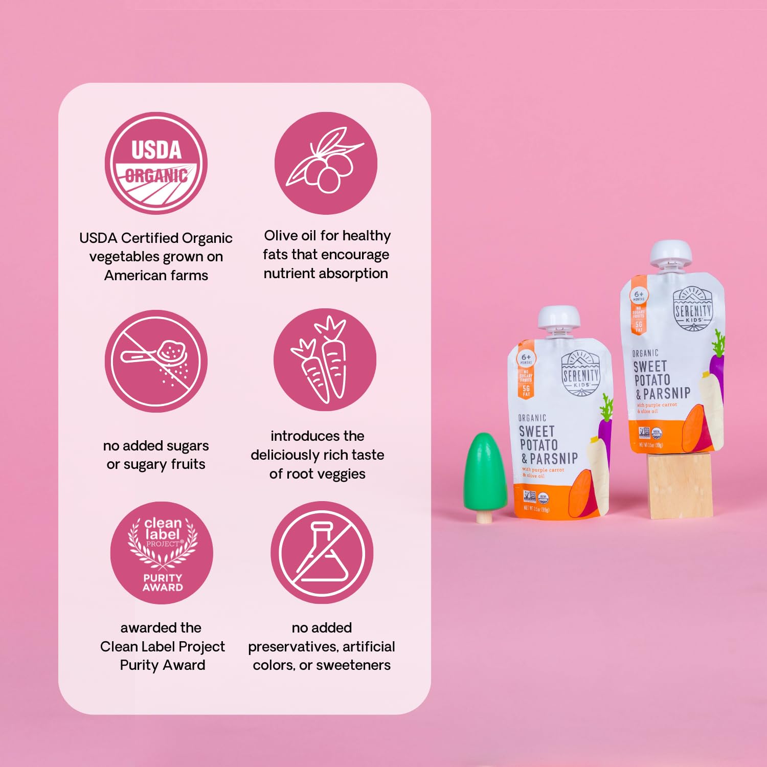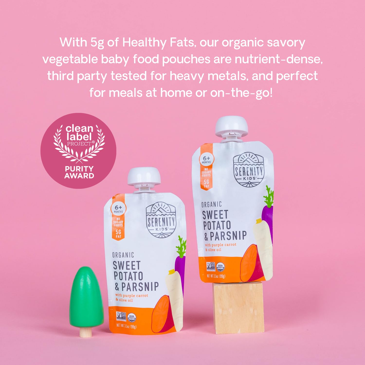 Serenity Kids 6+ Months USDA Organic Veggie Puree Baby Food Pouches | No Sugary Fruits or Added Sugar | Allergen Free | 3.5 Ounce BPA-Free Pouch | Sweet Potato & Parsnip | 6 Count