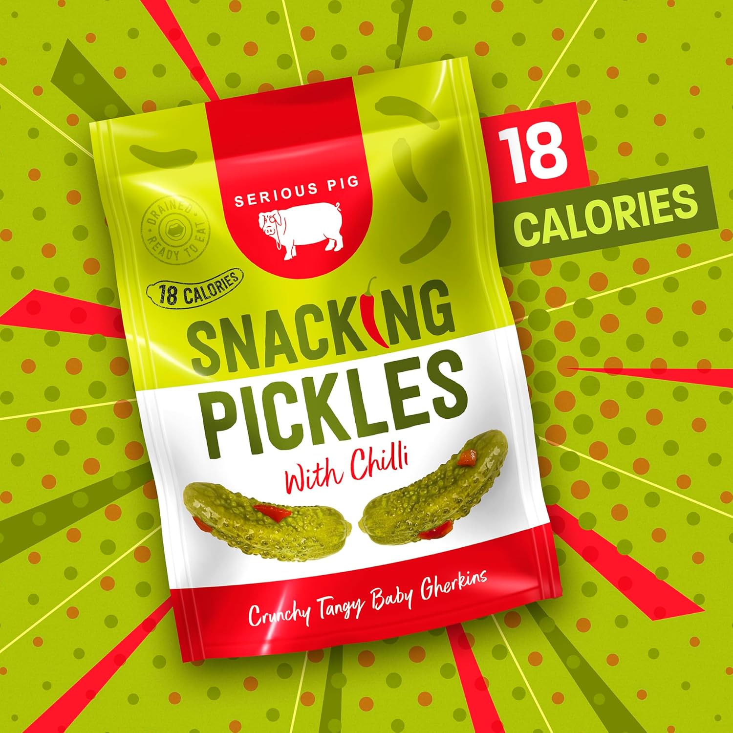 About this item SERIOUSLY CRUNCHY: A crunchy and tangy snack that’s seriously tasty and packs a punch. Great for parties, spreads, get-togethers, and more! PICKLED TO PERFECTION: We’ve sourced the finest, tastiest baby gherkins and gently pickled them to create our first Snacking Pickles. Drained and ready to eat for instant snacking satisfaction. VEGAN: These healthy, low-carb snacks are suitable for vegans and vegetarians. They’re also gluten free and lactose free for all to enjoy. SERIOUS FLAVOUR: Baby gherkins are pickled in a white vinegar, garlic and dill brine for a seriously punchy tang that’s off-the-chart tasty! BRITISH PUB SNACK: Serious Pig is a British premium snack brand born in the pub. Snacking Pickles is seriously good with ale, beer, cider, and wine - and equally delicious for snacking right out of the packet. › See more product details,SERIOUSLY CRUNCHY: A crunchy and tangy snack that’s seriously tasty and packs a punch. Great for parties, spreads, get-togethers, and more!,PICKLED TO PERFECTION: We’ve sourced the finest, tastiest baby gherkins and gently pickled them to create our first Snacking Pickles. Drained and ready to eat for instant snacking satisfaction,VEGAN: These healthy, low-carb snacks are suitable for vegans and vegetarians. They’re also gluten free and lactose free for all to enjoy,SERIOUS FLAVOUR: Baby gherkins are pickled in a white vinegar, garlic and dill brine for a seriously punchy tang that’s off-the-chart tasty!,BRITISH PUB SNACK: Serious Pig is a British premium snack brand born in the pub. Snacking Pickles is seriously good with ale, beer, cider, and wine - and equally delicious for snacking right out of the packet