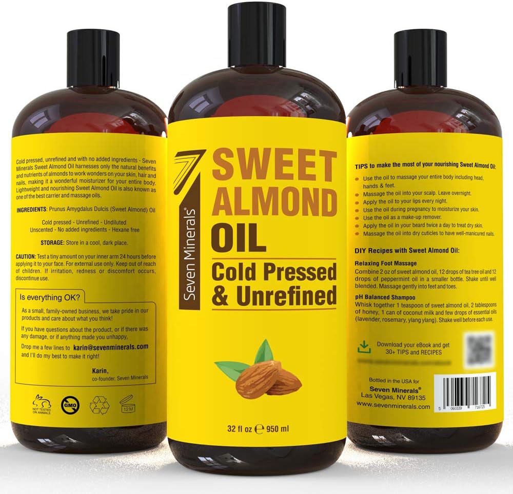 Seven Minerals, Pure Cold Pressed Sweet Almond Oil - Big 32 Fl Oz Bottle - Unrefined &100% Natural - For Skin & Hair, With No Added Ingredients - Perfect Carrier Oil For Essential Oils