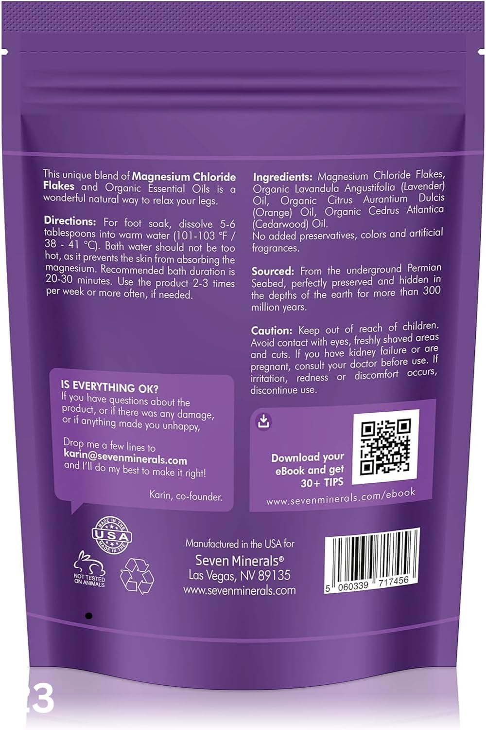 Seven Minerals Relaxing Legs Magnesium Chloride Flakes 3Lb – Absorbs Better Than Epsom Salt - Unique Foot Soak Formula For Tired Legs And Leg Cramps - With Orange, Cedarwood & Lavender