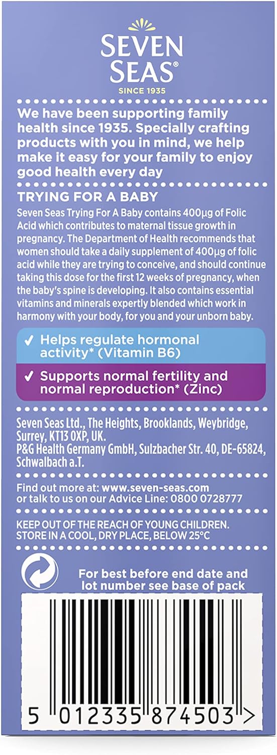 DESCRIPTION : Product Description Pre-Conception Multivitamin for women, containing an array of expertly blended pre-natal vitamins and nutrients formulated for when you are trying to conceive. The Department of Health recommends taking a daily supplement of 400?g of Folic Acid when you are trying for a baby and throughout the first 12 weeks of pregnancy. The importance of Folic Acid for pregnancy is well understood by new mums and by Seven Seas. Trying for a Baby mini tablets contain the recommended 400µg of Folic Acid. Folic Acid contributes to normal blood formation and normal maternal tissue growth during Pregnancy1 . Our one-a-day mini tablet contains: ? Zinc to support normal fertility4 - Vitamin B6 to help regulate hormonal activity2 - Vitamin D to support normal bones and the normal function of the immune system3 - Plus 5 further selected nutrients Dosage: One mini tablet a day, with food Contents: 28 mini tablets - 4 weeks’ supply - Blister pack with ‘days of the week’ guide Contains Biotin. Box – Recycle Blister - Don't Recycle ¹ Folic Acid contributes to normal blood formation and normal maternal tissue growth during pregnancy. 2 Vitamin B6 contributes to the regulation of hormonal activity. 3 Vitamin D contributes to the maintenance of normal bones and supports normal muscle function, normal function of the immune system. 4 Zinc contributes to normal fertility and normal reproduction. Food supplements must not replace a balanced diet and healthy lifestyle. Ingredients Ferrous Fumarate Dicalcium Phosphate Microcrystalline Cellulose Sodium Selenite Prep. (Calcium Carbonate, Sodium Selenite) Zinc Oxide Crosslinked Sodium Carboxy Methyl Cellulose Tablet Coat (Hydroxypropylmethyl Cellulose, Colours: Titanium Dioxide, Anthocyanins; Talc, Acidity Regulator: Citric Acid) Vitamin D Prep. (Maltodextrin, Ethylcellulose, Mixed Tocopherols, Cholecalciferol) Vitamin B12 Prep. (Mannitol, Cyanocobalamin) Pyridoxine Hydrochloride Stearic Acid Silicon Dioxide Magnesium Stearate Folic Acid Biotin Directions Take one pill a day. If you forget to take a pill, don't worry, simply miss a day. Do not exceed the recommended dosage. Safety Warning Food supplements are intended to supplement the diet and should not be regarded as a substitute for a varied diet and a healthy lifestyle. This product contains iron which, if taken in excess, may be harmful to very young children. Keep out of sight and reach. Box Contains 1 x Seven Seas Trying for a Baby 28 Capsules Manufacturer Contact Information PRE-CONCEPTION MULTIVITAMIN with Vitamin B6 to help regulate hormonal activity, Zinc to support normal fertility and reproduction, plus Folic Acid, Vitamin B12, Vitamin D and Iron