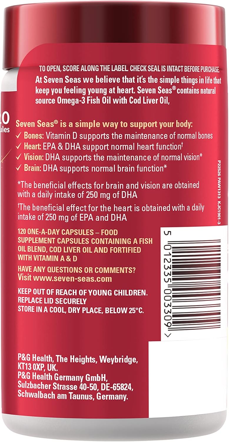 Seven Seas Cod Liver Oil Tablets With Omega-3, Fish Oil, One A Day, 4 Months Supply (120 Capsules), Epa & Dha, With High Strength Vitamin D & A