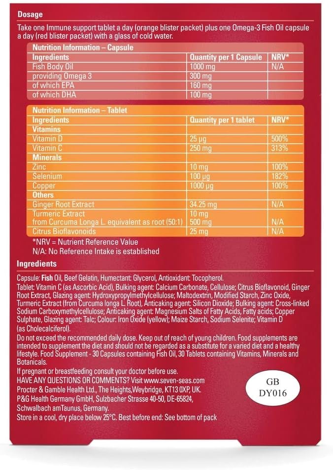 DESCRIPTION : Product Description Seven Seas Omega-3 & Immunity has been specifically developed to support your immune system³, with Vitamin C, Vitamin D, Zinc, Selenium and Copper. Plus Ginger and Turmeric Root Extracts. Omega-3 is essential as your body cannot produce it from scratch. Omega-3 supports three major organs in the body, the heart¹, brain² and eyes². When these organs work optimally, the heart pumps over 100,000 times a day, the brain passes information around at over 260 mph and over 100 million cells in the eye work to convert light into signals which enable you to see. Omega-3 is essential because the body can’t produce it from scratch and can only get it through outside sources such as diet and supplements. We call it 'The Oil of Life'. It also supports: ¹Heart: EPA & DHA contributes to normal heart function. ²Brain: DHA contributes to the maintenance of normal brain function. ²Vision: DHA helps support the maintenance of normal vision. ¹The beneficial effect for the heart is obtained with a daily intake of 250 mg EPA and DHA. ²The beneficial effects for brain and vision are obtained with a daily intake of 250 mg DHA. ³Vitamin C, Vitamin D, Zinc, Selenium and Copper each contribute to the normal function of the immune system. ?Vitamin D supports the maintenance of normal bones. How to use Dosage: Take one Immune System Support tablet a day plus one Omega-3 Fish Oil capsule a day with a glass of cold water. Contains fish oil and beef gelatine. Lactose free, gluten free. Box - Recycle Blister - Don't Recycle ?A daily intake of 250mg EPA (Eicosapentaenoic Acid) and DHA (Docosahexaenoic Acid) helps support normal heart function. 250mg DHA daily helps support normal vision and brain function. Vitamin D helps support the normal function of muscles, immune system, normal bones and plays a role in cell division. ?Seven Seas Omega-3 fish oils are in Triglyceride form, a more absorbable Omega-3 form vs Ethyl esters Food supplements must not replace a balanced diet and healthy lifestyle. Ingredients Capsule: FISH Oil, Beef Gelatin, Humectant: Glycerol, Antioxidant: Tocopherol. Tablet: Vitamin C (as Ascorbic Acid); Bulking agent: Calcium Carbonate, Cellulose; Citrus Bioflavonoid Complex; Glazing agent: Hydroxypropylmethylcellulose; Ginger Root Extract; Maltodextrin; Modified Starch; Zinc Oxide, Turmeric Extract (from Curcuma longa L.); Anticaking agent: Silicon Dioxide; Bulking agent: Cross-linked Sodium Carboxymethylcellulose, Anticaking agent: Magnesium Salts of Fatty Acids, Fatty acids; Copper Sulphate; Glazing agent: Talc; Colour: Iron Oxide (yellow); Maize Starch; Sodium Selenite; Vitamin D (as Cholecalciferol). Safety Warning sytay away from eye contact Manufacturer Contact Information Procter & Gamble UK, Weybridge, Surrey, KT13 0XP