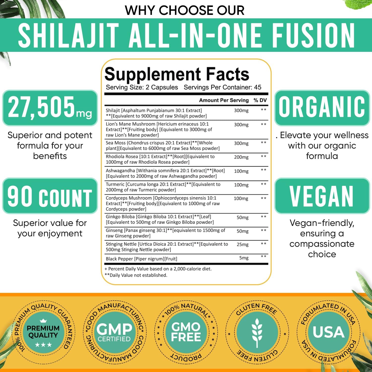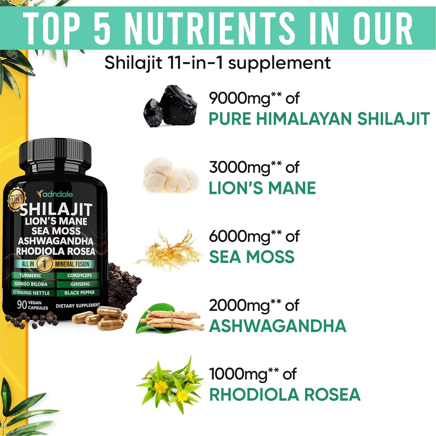 Comprehensive Ultra Force 11-In-1 Shilajit Fusion: Adndale Introduces A Revolutionary Supplement Featuring Himalayan Shilajit, Ashwagandha, Rhodiola, Panax Ginseng, Ginkgo Biloba, Lion'S Mane, Sea Moss, Black Pepper, Turmeric, Stinging Nettle, And Cordyceps. This Advanced Fusion Shilajit Capsules Combine The Power Of 11 Potent Ingredients In A Single, Convenient Formula, Supporting Your Energy, Stamina, Vitality And Overall Wellness