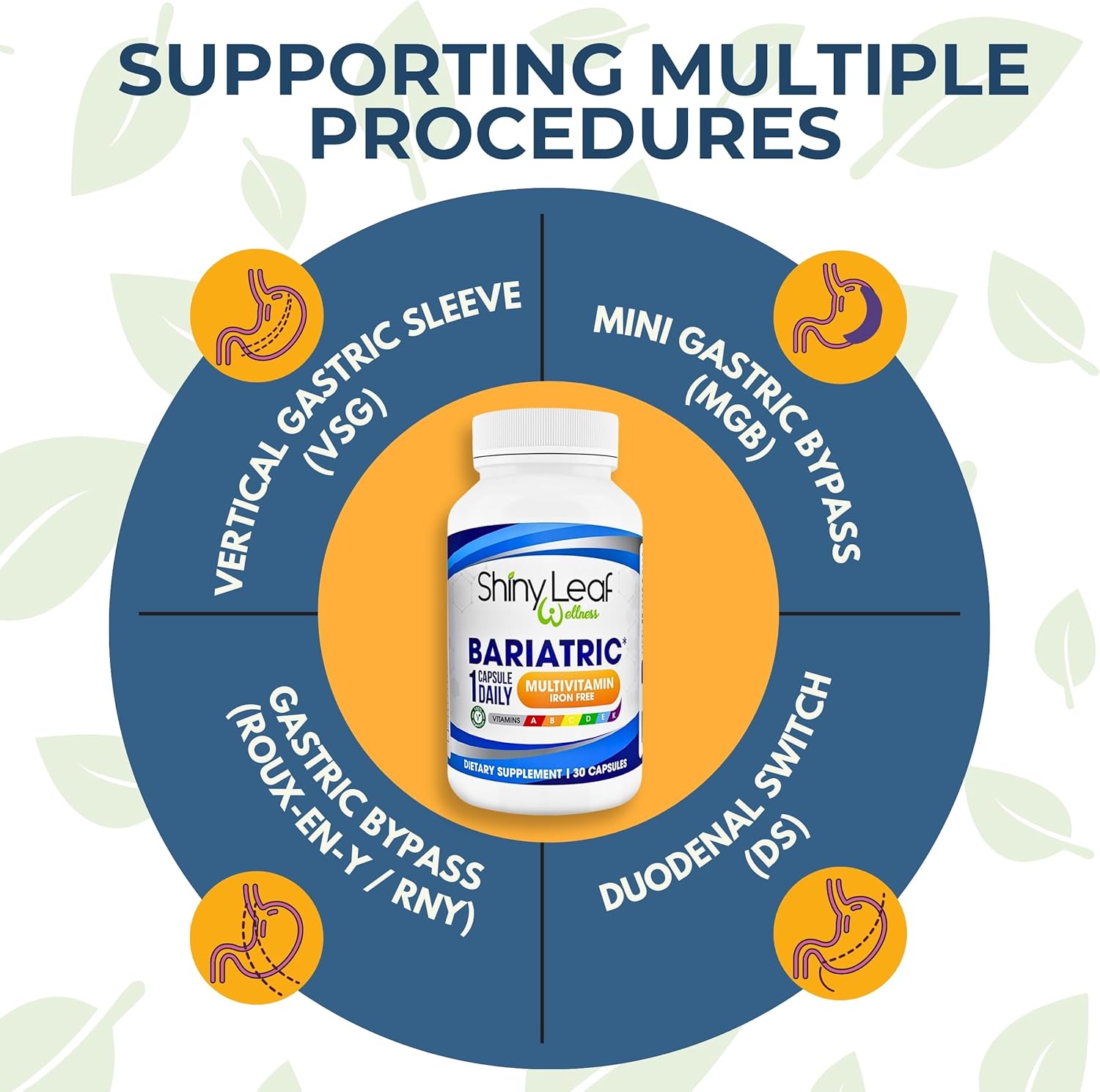 About this item Customized Nutrition for Bariatric Success: Experience peace of mind with Shiny Leaf Bariatric Multivitamin, designed specifically for post-bariatric surgeries like gastric bypass, Roux-en-Y, vertical sleeve, duodenal switch, mini gastric bypass and Revisions. Ensuring precise support with 20+ essential vitamins and minerals, it's the ultimate companion for your weight loss journey, aligning perfectly with ASMBS guidelines for optimized recovery and sustained health. Gentle and Side-Effect Free Formula: Soothe your post-surgery worries with our gentle-on-the-stomach formula, providing essential nutrients without the risk of nausea or unpleasant aftertastes. Made without iron, it ensures that your daily wellness routine is smooth and hassle-free, so you can focus on your new beginning without compromise. Optimal Absorption for Maximum Benefits: Maximize your health outcomes with our high-potency, one-a-day capsule designed for superior absorption. Enjoy all the benefits of vital nutrients like Vitamin D, Biotin, and Zinc, Vitamin A, Several Vitamin B types, K, Folate, Magnesium, Iodine, Niacin and more empowering you with boosted energy levels and immunity support to thrive after your surgery, fulfilling your body's specific nutritional requirements effortlessly. Soy-Free and Vegetarian Friendly: Feel confident with every capsule knowing our formula is soy-free and vegetarian. Prioritizing pure ingredients, it caters to diverse dietary preferences without sacrificing efficacy. Proudly crafted in the USA in a GMP-certified facility, its third-party testing guarantees top-notch quality and safety, making it a reliable choice for your lifestyle. Convenient Subscription Options: Achieve your health goals without interruption, thanks to our seamless subscription offerings ranging from 1 to 12 months. Whether you're freshly post-op or maintaining your progress, our bariatric vitamins for gastric bypass and gastric sleeve adapt to your needs, providing consistent support tailored to enhance your wellness journey. See more product details,Customized Nutrition for Bariatric Success: Experience peace of mind with Shiny Leaf Bariatric Multivitamin, designed specifically for post-bariatric surgeries like gastric bypass, Roux-en-Y, vertical sleeve, duodenal switch, mini gastric bypass and Revisions. Ensuring precise support with 20+ essential vitamins and minerals, it's the ultimate companion for your weight loss journey, aligning perfectly with ASMBS guidelines for optimized recovery and sustained health,Gentle and Side-Effect Free Formula: Soothe your post-surgery worries with our gentle-on-the-stomach formula, providing essential nutrients without the risk of nausea or unpleasant aftertastes. Made without iron, it ensures that your daily wellness routine is smooth and hassle-free, so you can focus on your new beginning without compromise,Optimal Absorption for Maximum Benefits: Maximize your health outcomes with our high-potency, one-a-day capsule designed for superior absorption. Enjoy all the benefits of vital nutrients like Vitamin D, Biotin, and Zinc, Vitamin A, Several Vitamin B types, K, Folate, Magnesium, Iodine, Niacin and more empowering you with boosted energy levels and immunity support to thrive after your surgery, fulfilling your body's specific nutritional requirements effortlessly,Soy-Free and Vegetarian Friendly: Feel confident with every capsule knowing our formula is soy-free and vegetarian. Prioritizing pure ingredients, it caters to diverse dietary preferences without sacrificing efficacy. Proudly crafted in the USA in a GMP-certified facility, its third-party testing guarantees top-notch quality and safety, making it a reliable choice for your lifestyle,Convenient Subscription Options: Achieve your health goals without interruption, thanks to our seamless subscription offerings ranging from 1 to 12 months. Whether you're freshly post-op or maintaining your progress, our bariatric vitamins for gastric bypass and gastric sleeve adapt to your needs, providing consistent support tailored to enhance your wellness journey