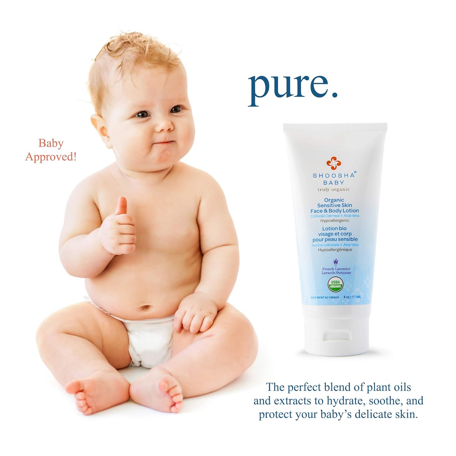 Shoosha Organic Baby Lotion French Lavender, For Sensitive Skin, All Natural Face And Body Lotion For Kids, Hypoallergenic, Gluten-Free, Non-Sticky, 100% Biodegradable