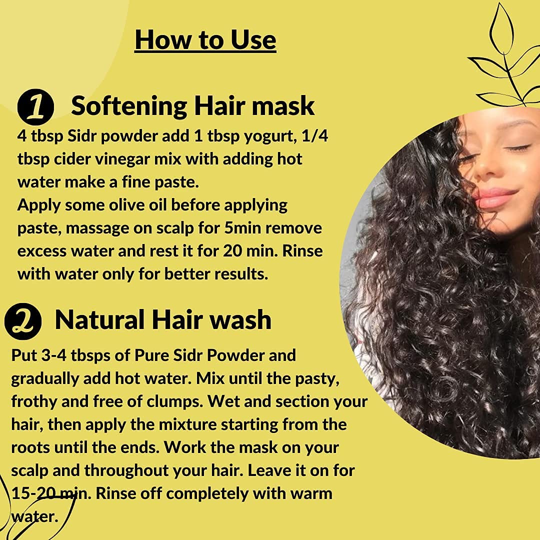 HAIR MASK-Put 3-4 tbsps of Pure Sidr Powder and gradually add hot water. Mix until the pasty, frothy and free of clumps. Wet and section your hair, then apply the mixture starting from the roots until the ends. Work the mask on your scalp and throughout your hair. Leave it on for 15-20 min. Rinse off completely with warm water