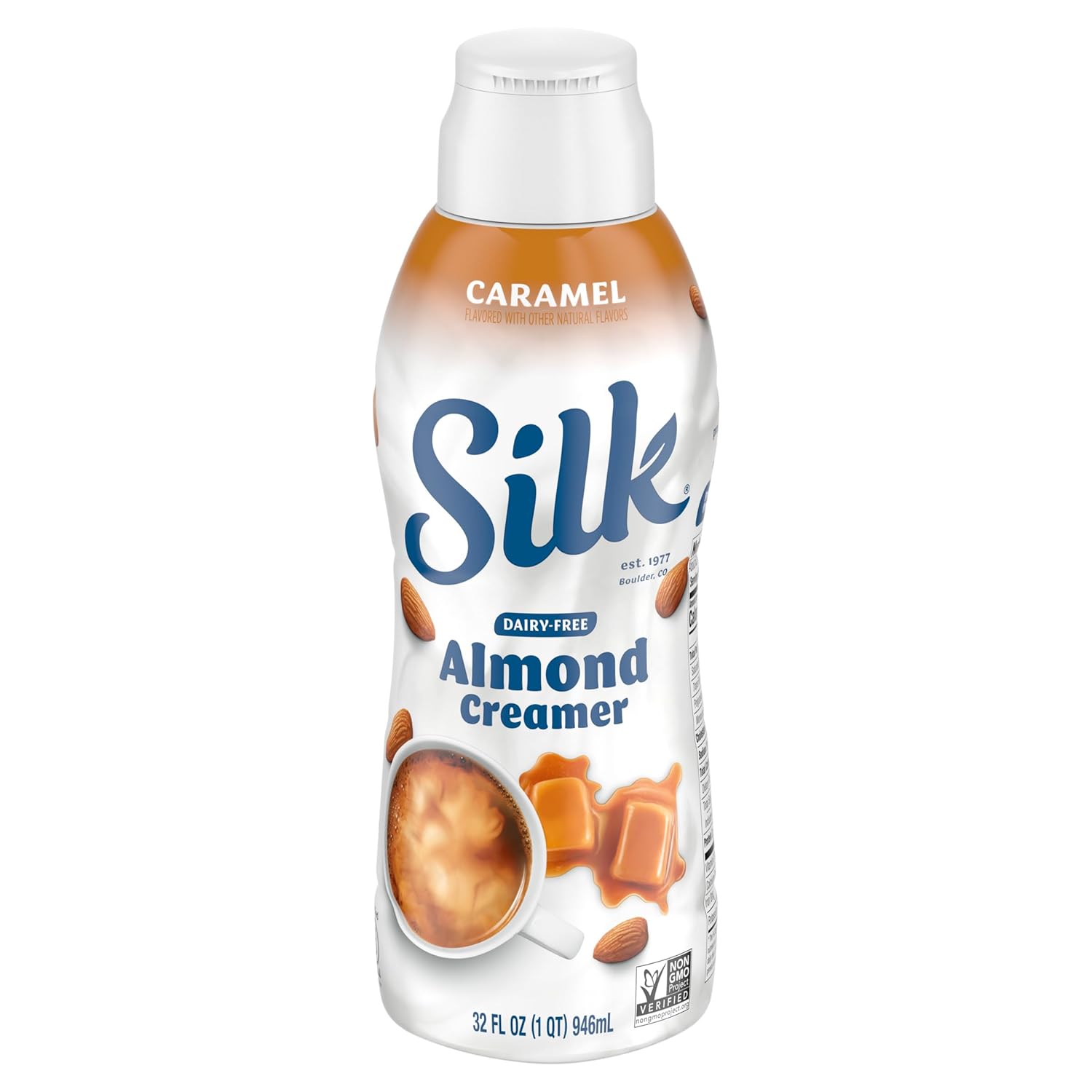 About this item Lusciously Creamy: One 32 fl oz Silk Caramel Dairy Free, Gluten Free Almond Creamer Carton Nothing but Delicious: This caramel flavored creamer has no dairy, lactose, carrageenan or gluten, just smooth and creamy goodness Have a “Me” Moment: Add these non dairy creamers to coffee, smoothies and shakes to make your mornings - or any time of day - more special Only The Best: Silk dairy free creamer is the #1 brand of plant based, dairy free creamers, based on national sales data* More Than Great Taste: Silk is passionate about doing right by the planet, which is why we're helping almond farmers implement regenerative agriculture practices See more product details,Lusciously Creamy: One 32 fl oz Silk Caramel Dairy Free, Gluten Free Almond Creamer Carton,Nothing but Delicious: This caramel flavored creamer has no dairy, lactose, carrageenan or gluten, just smooth and creamy goodness,Have a “Me” Moment: Add these non dairy creamers to coffee, smoothies and shakes to make your mornings - or any time of day - more special,Only The Best: Silk dairy free creamer is the #1 brand of plant based, dairy free creamers, based on national sales data,More Than Great Taste: Silk is passionate about doing right by the planet, which is why we're helping almond farmers implement regenerative agriculture practices