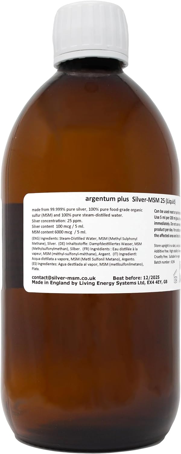 DESCRIPTION : Product description argentum plus Silver-MSM 25 (liquid) contains silver and MSM (Methyl Sulfonyl Methane) which is an organic form of sulphur. A relatively high silver concentration of 25 parts per million (ppm) creates a very powerful silver effect: Combining silver and MSM into a single high strength compound increases many times the effects each substance has on its own: Together in colloidal suspension the activity of the silver particles is significantly prolonged and sustained efficacy results. This ensures that Silver-MSM 25 (liquid) has the extra strength required for persistent conditions. Ingredients Steam-Distilled Water, Methyl Sulphonyl Methane (MSM), Silver