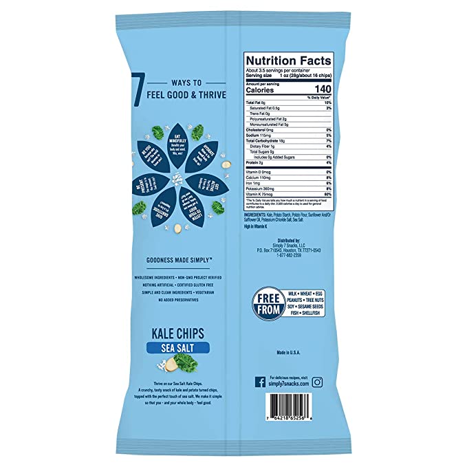 Multi-Serving Bags: Contains 12 – 3.5oz bags. Approximately 42 Servings Total. Sea Salt Kale Chips: A crunchy, tasty snack of kale and potato turned chips, topped with the perfect touch of sea salt. We make it simple so that you – and your whole body – feel good. Gluten Free & Non-GMO: Non-GMO Project Verified, Certified Gluten Free, Kosher, Nut Free, Vegetarian, Vegan, Plant-Based, Cholesterol Free Free From: Milk, wheat, egg, soy, shellfish, fish, peanuts, tree nuts, and sesame seeds for food sensitive diets. Low Fat & High Vitamin K: Contains 0g Trans Fat per serving and 60% of your daily value of Vitamin K per serving. Talk about an added bonus!. Simply 7 Kale Chips - Gluten Free Snacks - Vegan Snacks - Non-GMO, Vegetarian, Vegan, High Vitamin K, Low Fat, Sugar Free, Plant-Based, Cholesterol Free, Kosher - Sea Salt, 3.5oz, 12pk